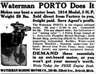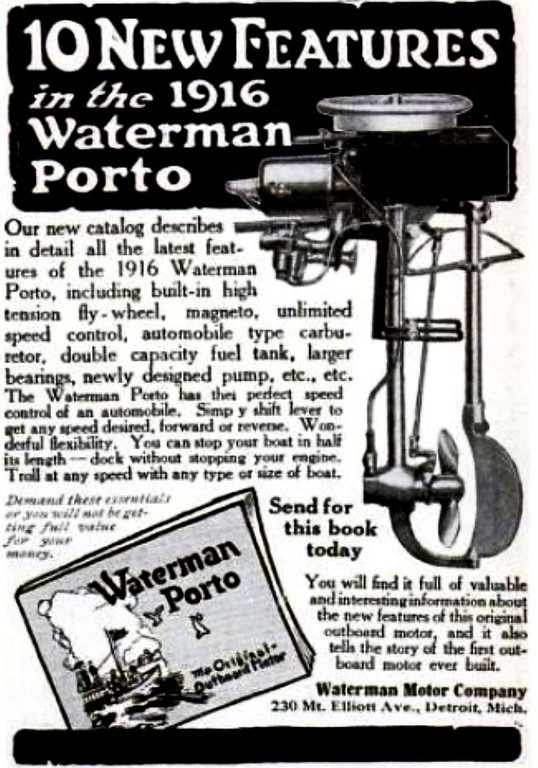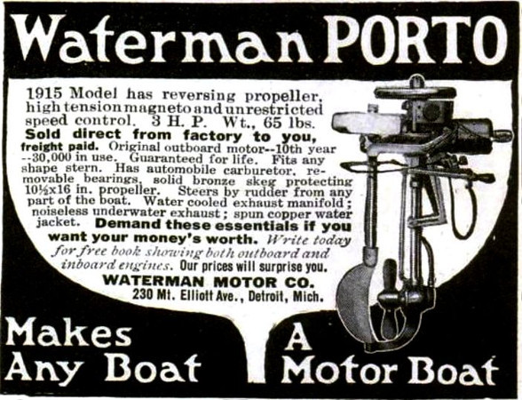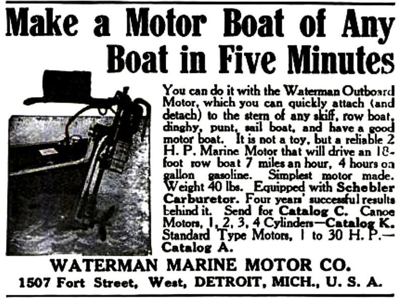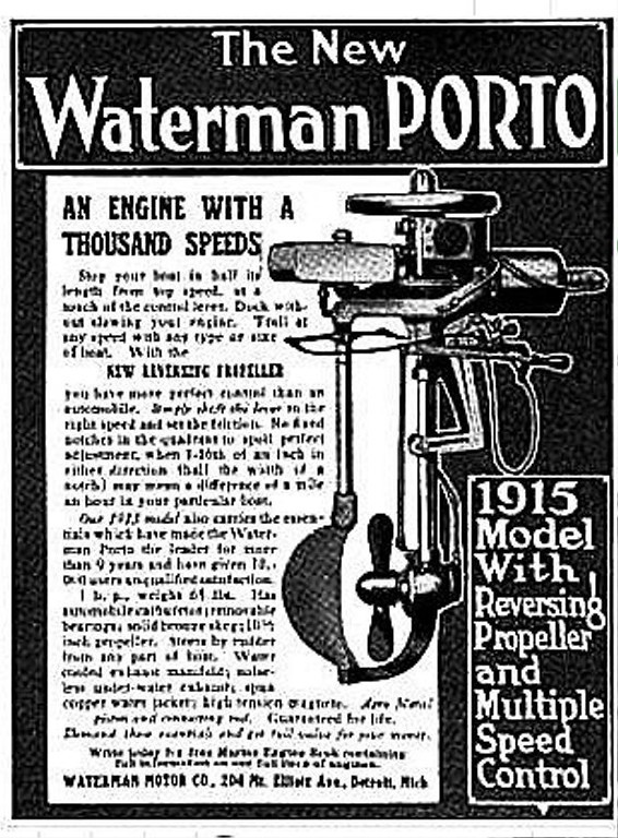 Den äldsta, mer kommersiellt exploaterade utombordsmotorn i världen, får nog anses vara, Cameron B. Watermans Outboard som kom ut 1905. Denna första motor var luftkyld och drev propellern via en kedja. År 1906 hade den fått dubbla vinkelväxlar samt vatten kyld cylinder med utanpåliggande svänghjul. År 1907 var den enda större förändringen att svänghjulet var inbyggt i vevhuset.