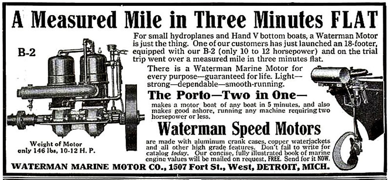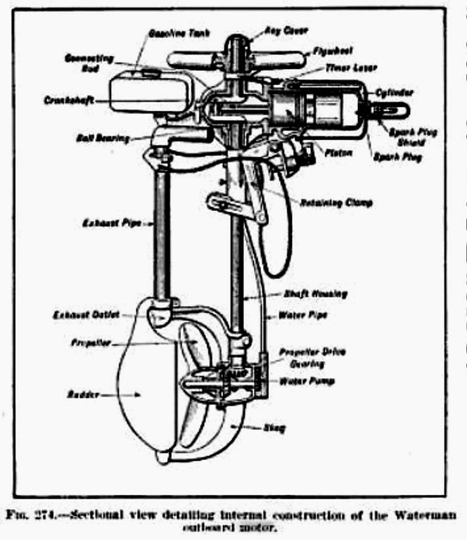 Старейшим и наиболее коммерчески эксплуатируемым подвесным мотором в мире, вероятно, можно считать подвесной двигатель Кэмерона Б. Уотермана, выпущенный в 1905 году. Этот первый двигатель имел воздушное охлаждение и приводил в движение гребной винт с помощью цепи. К 1906 году он был оснащен сдвоенными коническими шестернями, а также цилиндрами с водяным охлаждением и подвесными маховиками. В 1907 году единственным существенным изменением стало то, что маховик был встроен в картер.