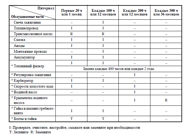 Раз в год инспекция, раз в три года или 300 моточасов замена. Это мануал Сузуки ДТ 30