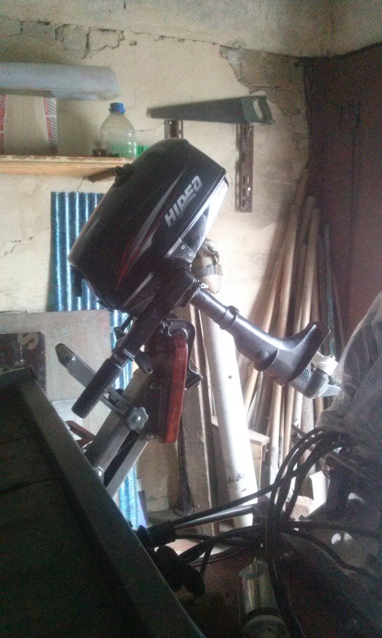 А вот этот откидной транец, можете растояние померять ,сколько от кормы до крепления доп мотора?в разложенномАндрей вот такой "малыш" был с реверсом (нейтраль, вперёд) и газом на румпеле, ну и висел на доп. транце так. Да, вес 13кг.