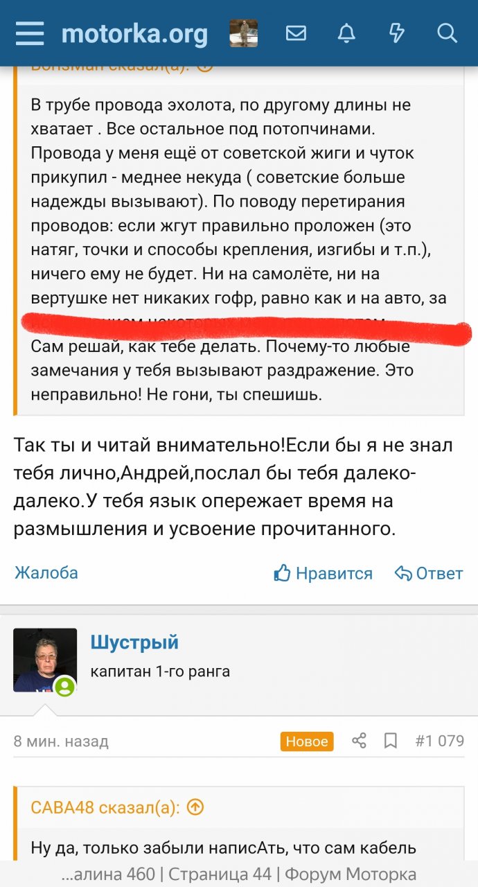 В трубе провода эхолота, по другому длины не хватает . Все остальное под потопчинами. Провода у меня ещё от советской жиги и чуток прикупил - меднее некуда ( советские больше надежды вызывают). По поводу перетирания проводов: если жгут правильно проложен (это натяг, точки и способы крепления, изгибы и т.п.), ничего ему не будет. Ни на самолёте, ни на вертушке нет никаких гофр, равно как и на авто, за исключением некоторых мест под капотом.