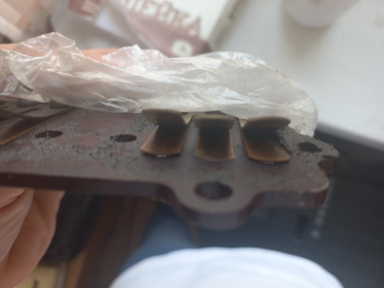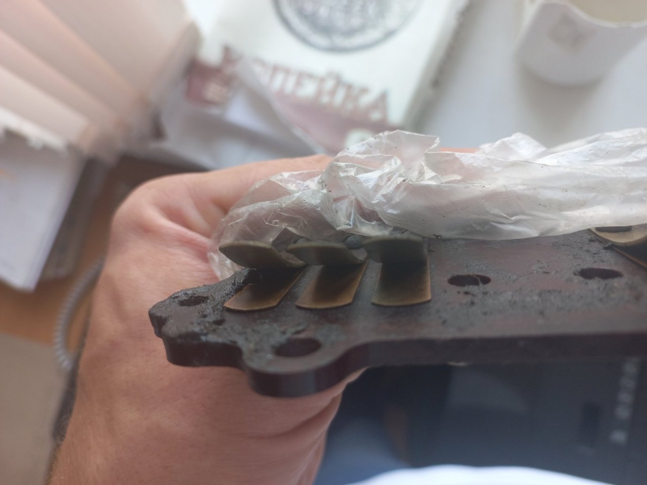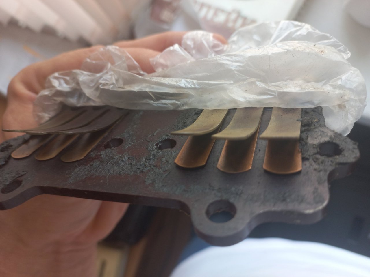 Вчера снимал крышку и плиту с клапанами и нашел вот такие сюрпризы. Нижний лепесток клапана нижнего цилиндра удерживался краем прокладки. На верхнем прокладка чуть-чуть не повторила ситуацию нижнего цилиндра "в притык" так сказать.