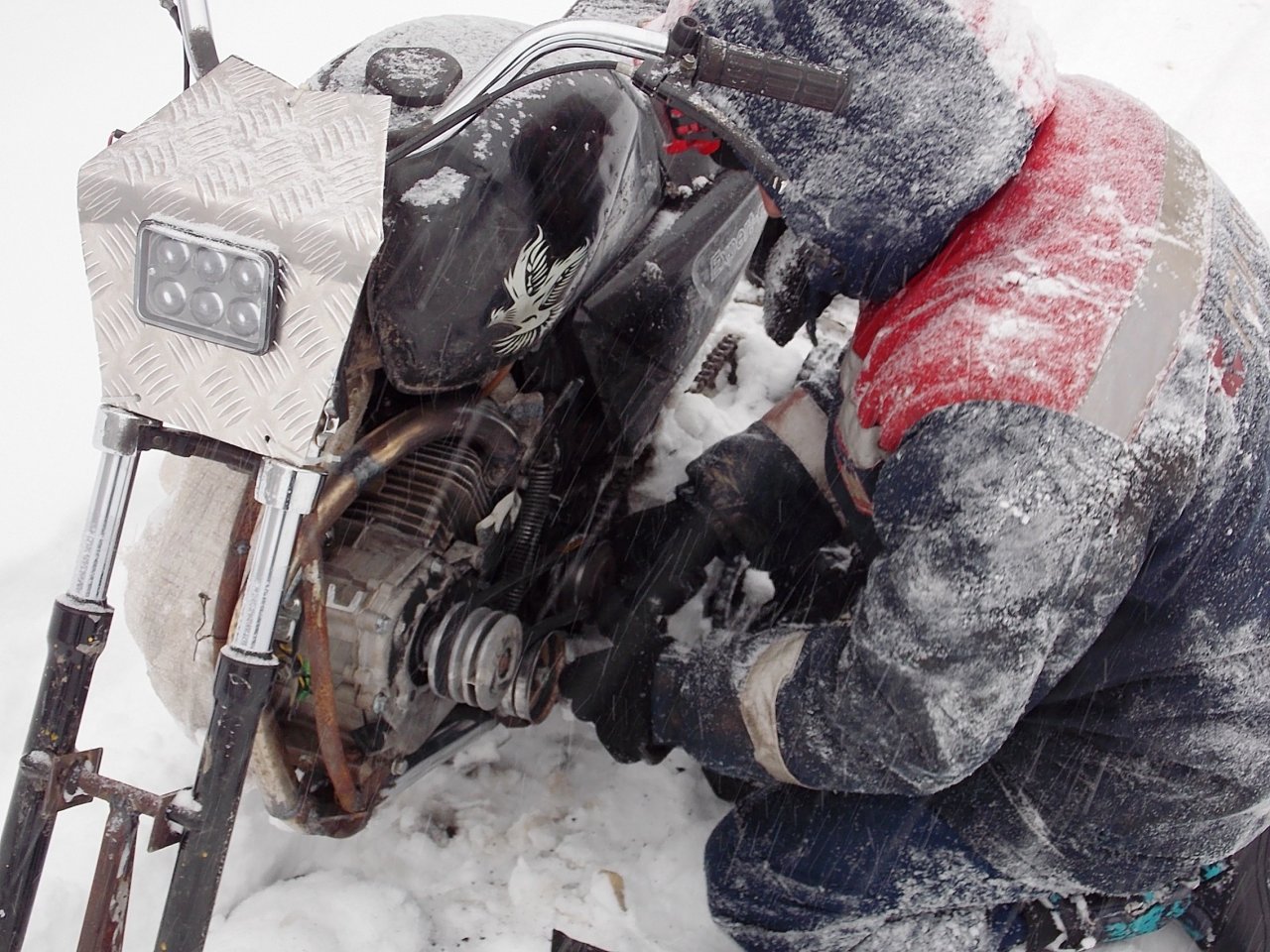 Альфа, на гусенице. Двигатель Лифан-6, замотан элементарным мешком. Иначе просто забьет снегом все щели, в том числе и фильтр.