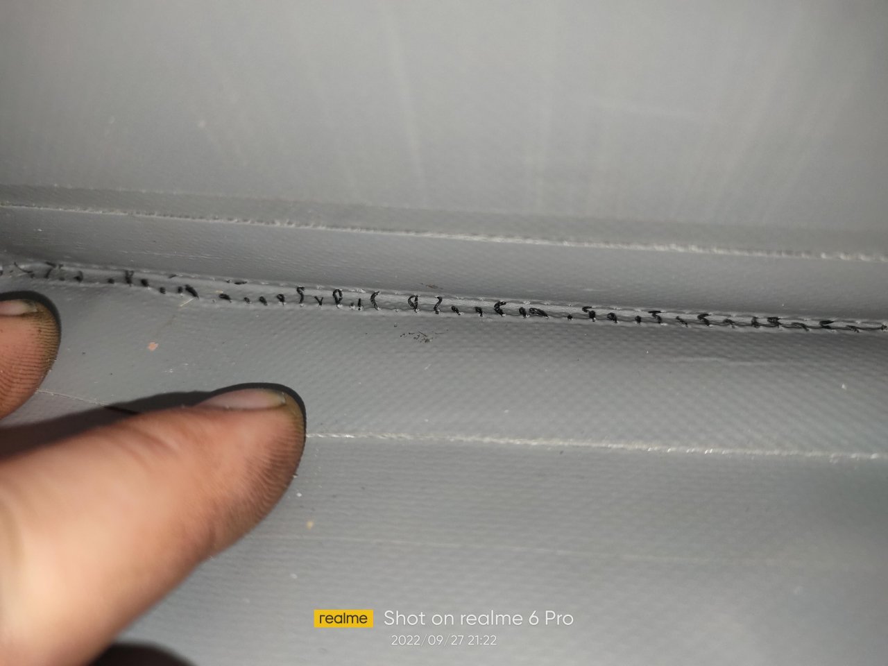 Здравствуйте Уважаемые форумчане. Подскажите пожалуйста, это нормально что нитками сшито и шов разошёлся? Это около транца. Лодка новая, месяц ей, на воде ни разу не была. Что можно сделать или ни чего не надо делать?
