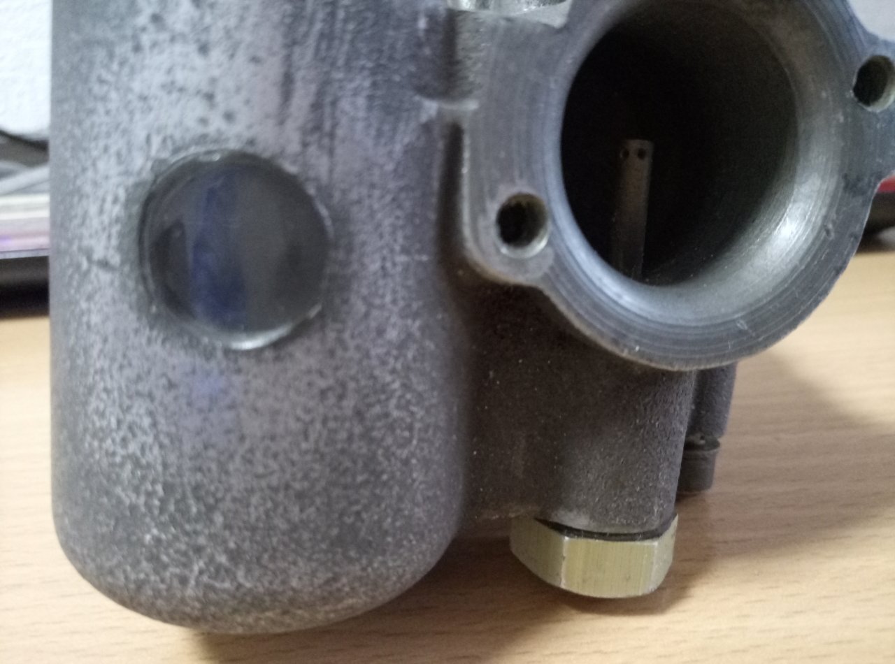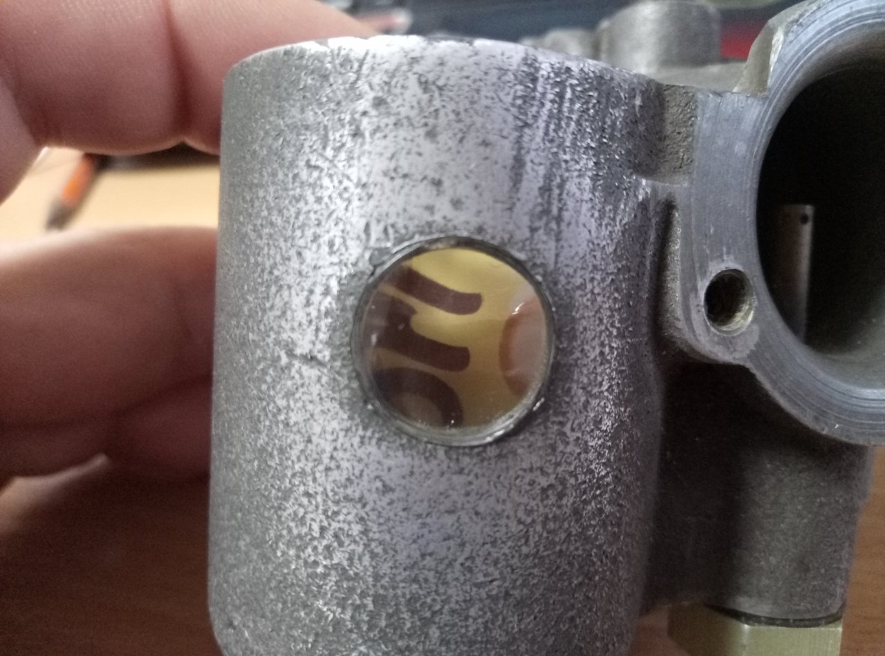 делал окошки так...в нужном месте камеры сверлишь отверстие и режешь МЕЛКУЮ резьбу на 10...кусочек толстого оргстекла обтачиваешь на наждаке так ,чтобы получился на его конце небольшой конус,с началом конуса в примерно в 10мм..плашкой с той же мелк.резьбой делаешь пару ниток резьбы на кончике конуса..и вдавливая с усилием,туго вкручиваем в камеру на всю толщину её стенки.(двух ниток резьбы достаточно на конусе,т.к.резьба в стенке камеры сама нарежет в оргстекле себе недостающую резьбу,тем самым обеспечив герметизацию)..по наружней стенке камеры оргстекло обрезаем,обтачиваем и полируем(не забыть до закручивания отполировать торец конуса,который будет находится внутри камеры!!!)..получается удобное,монолитное с корпусом,культурное прозрачное окошко..время тратится не более 30 минут...в процессе работы,на дно камеры и в диффузор я наталкивал бинт,исключая попадания алюм.пыли и стружки в каналы........если кому надо,то на днях могу отфотать карб с таким окошком,да можно и сам процесс на старом карбе показать..