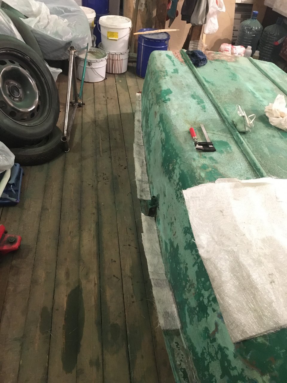 Так как лодка выглядит мягко сказать не очень, то было решено забрать ее к себе для восстановления внешнего вида и небольшого ремонта. Старая краска вся отваливается, мне удалось разглядеть 4 слоя краски, привалочный брус, а точнее корпус где обычно находится привалочный брус местами сколот, нужно клеить.