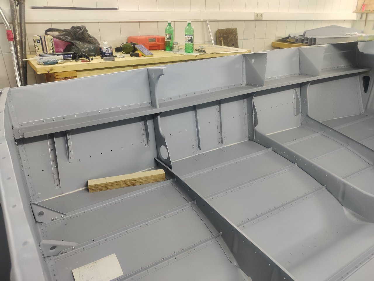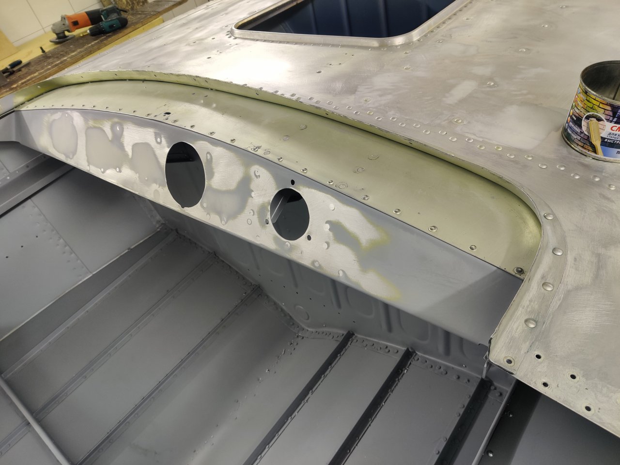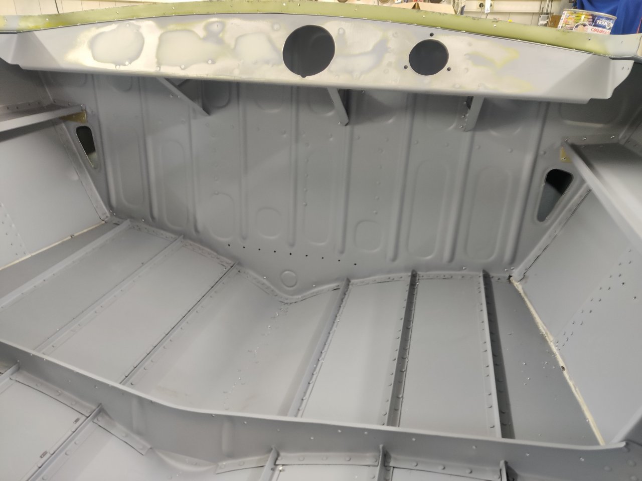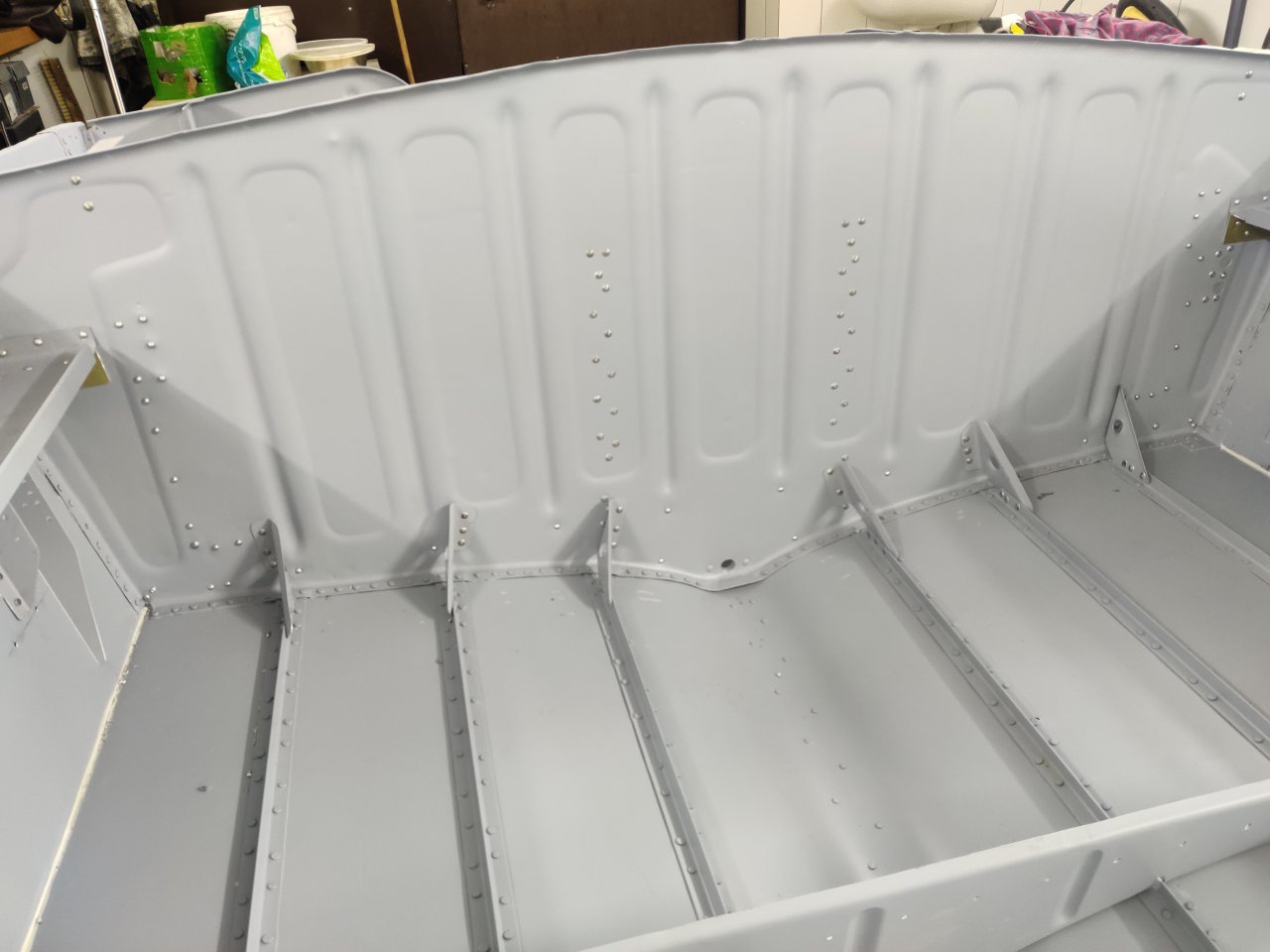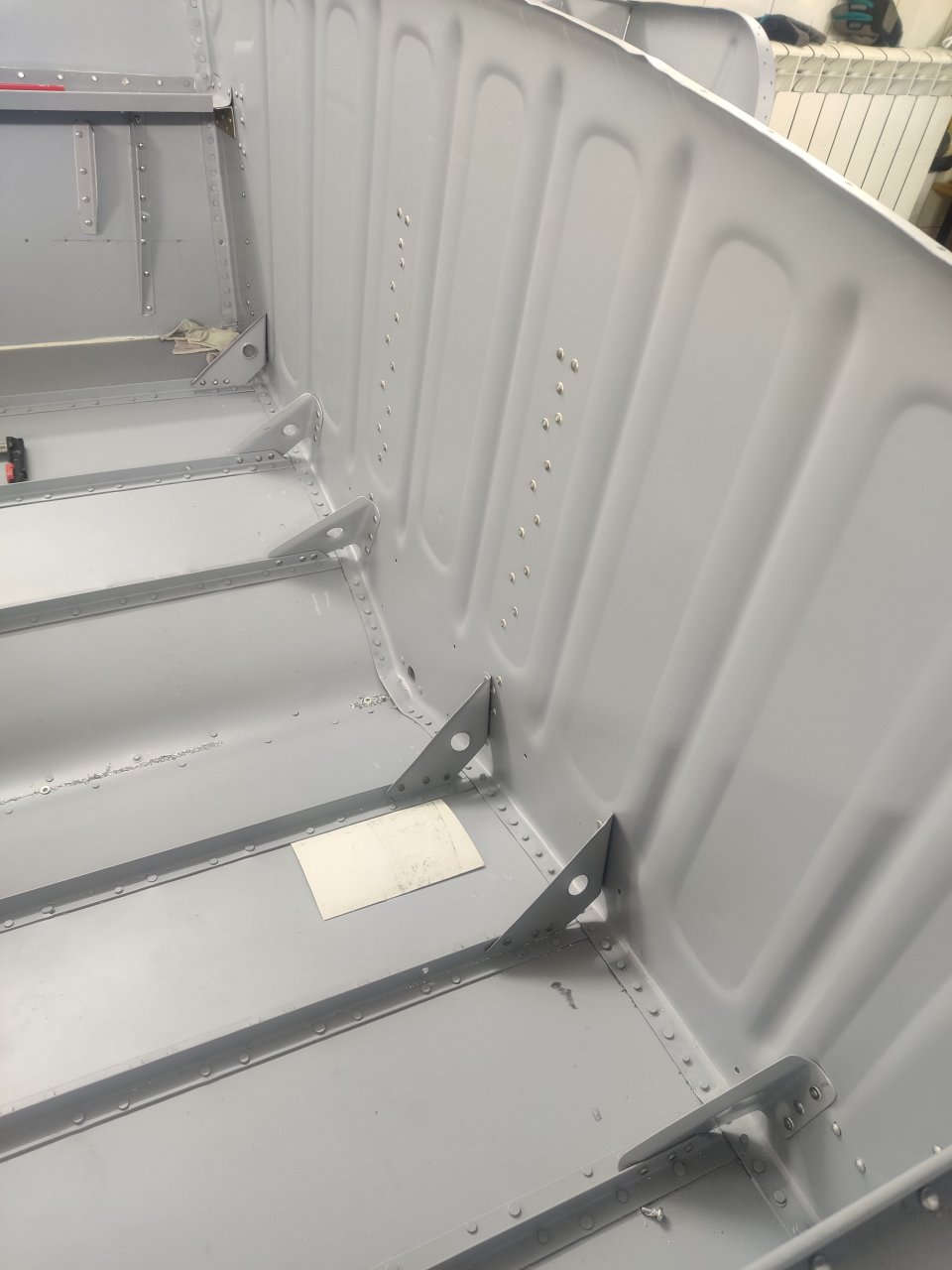 Чуток поработали. Косынки и кронштейны на местах, окрашены предсборки и элемены изнутри. ЭП шпаклся классно держится, на фото видно, как заклёпки вогнаны в нее, но слой очень тонкий. Краска Polimer Marine, ,ПУ, она матовая на их же ЭП грунте.