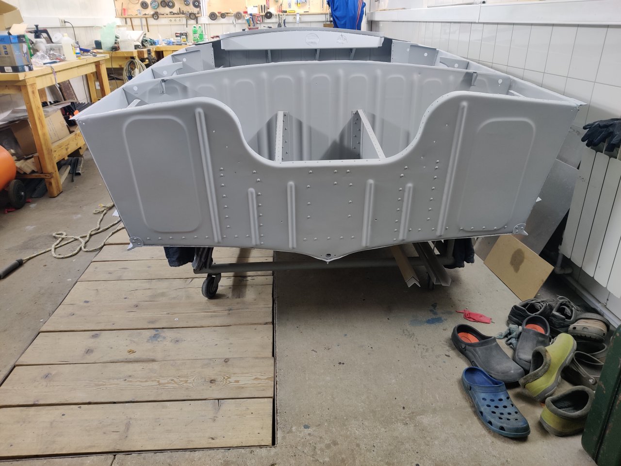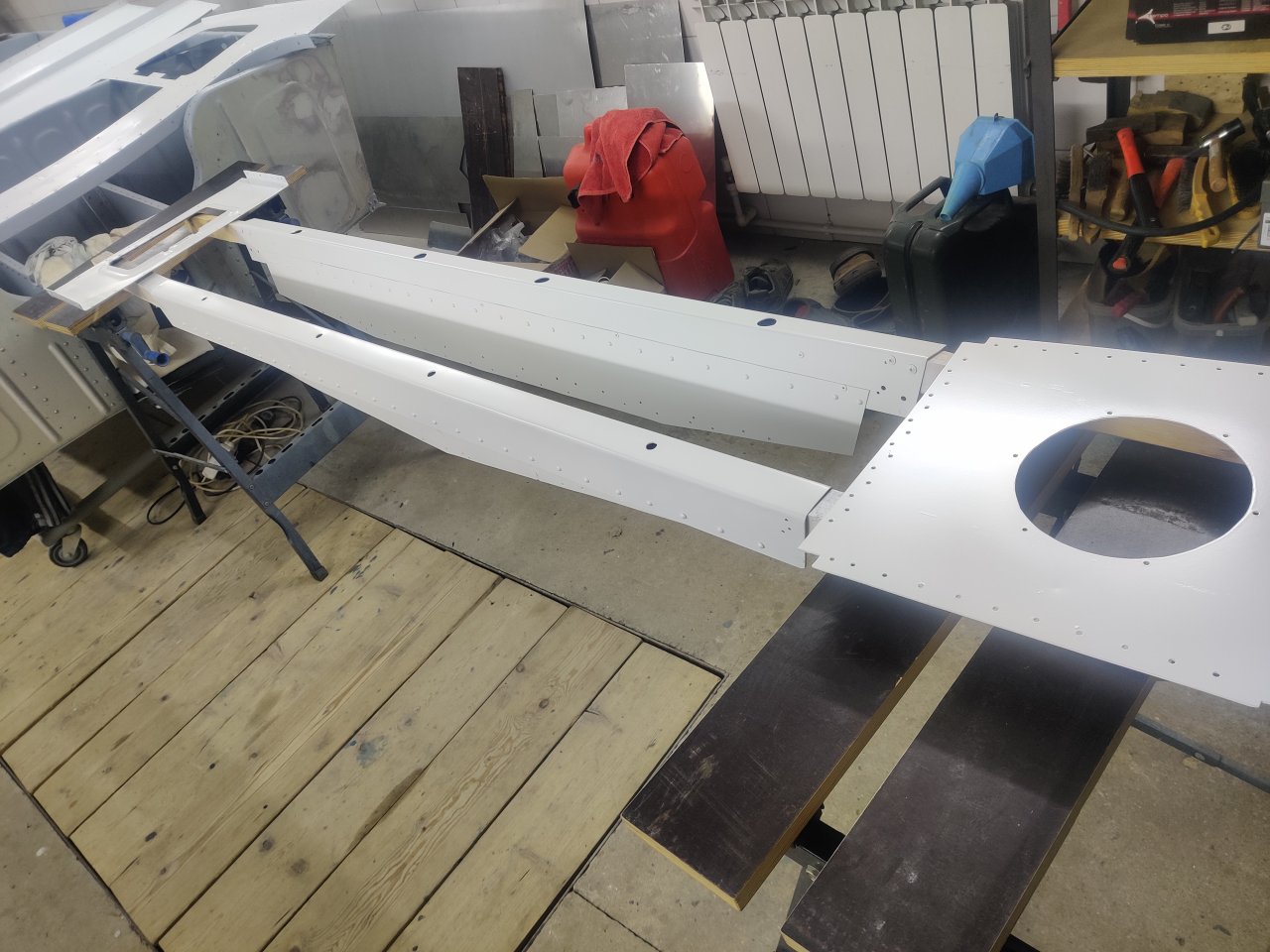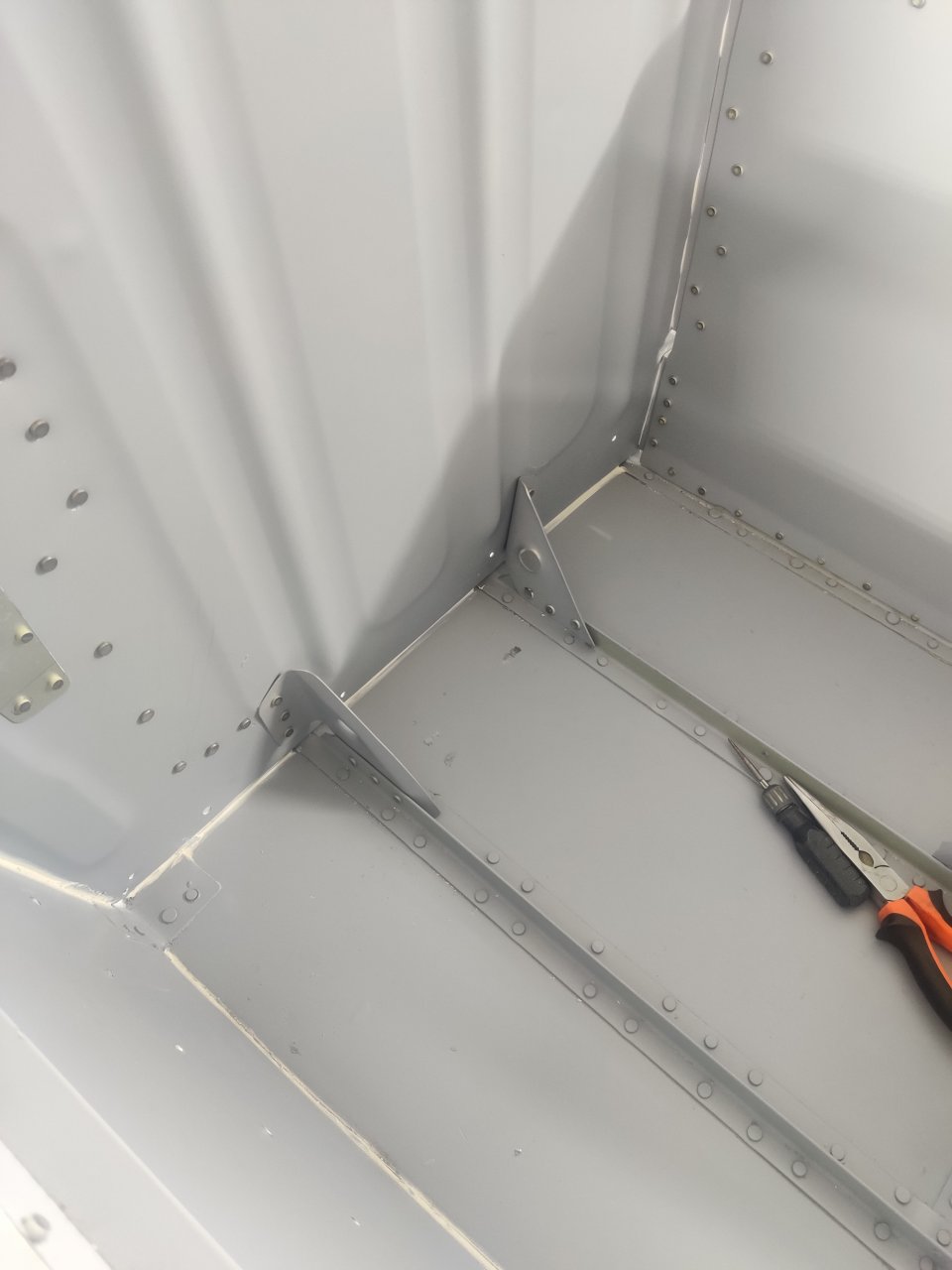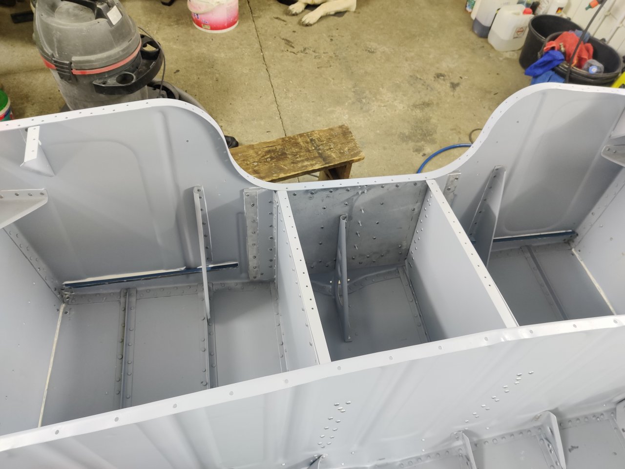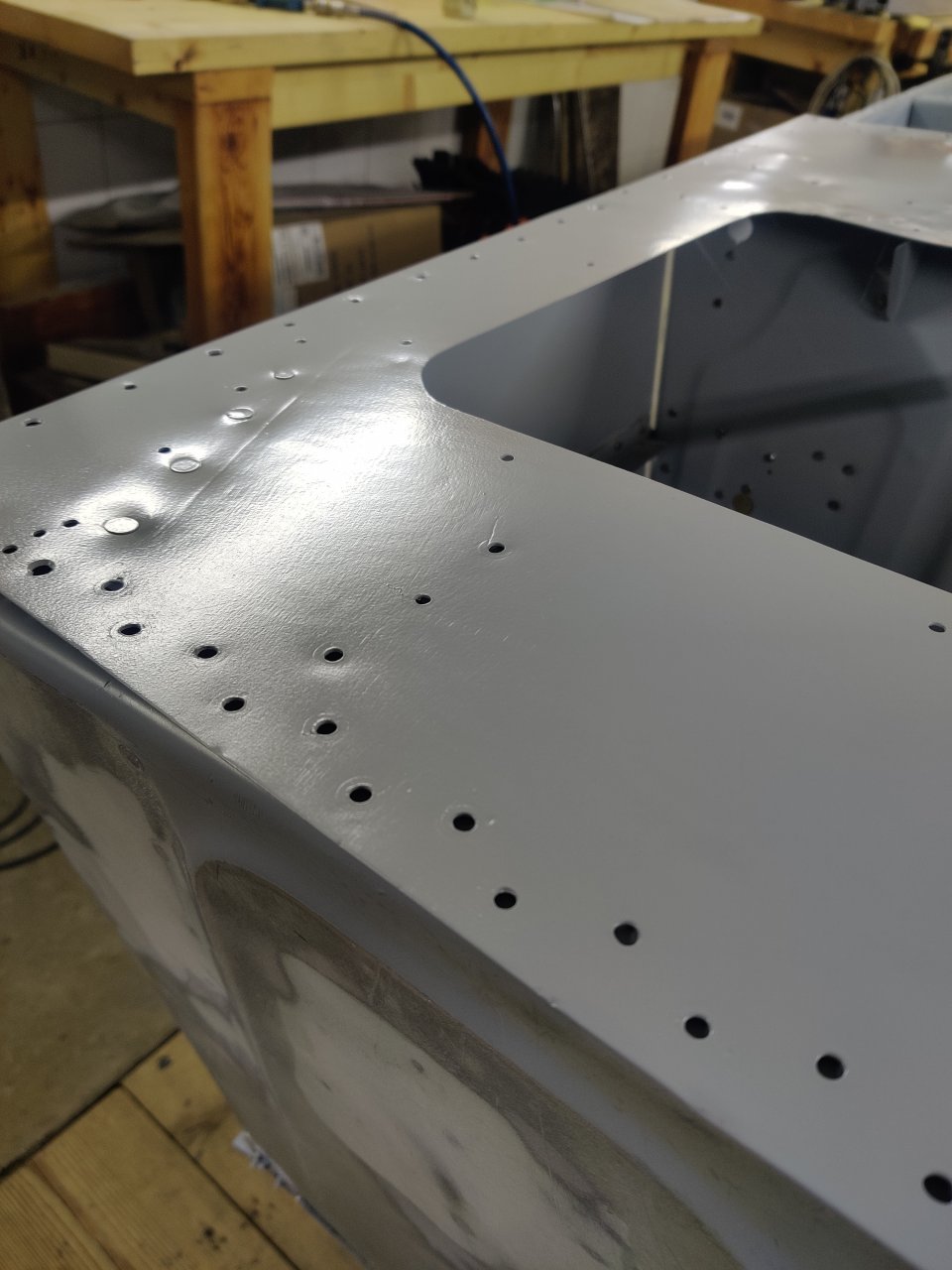 Чуток поработали. Косынки и кронштейны на местах, окрашены предсборки и элемены изнутри. ЭП шпаклся классно держится, на фото видно, как заклёпки вогнаны в нее, но слой очень тонкий. Краска Polimer Marine, ,ПУ, она матовая на их же ЭП грунте.