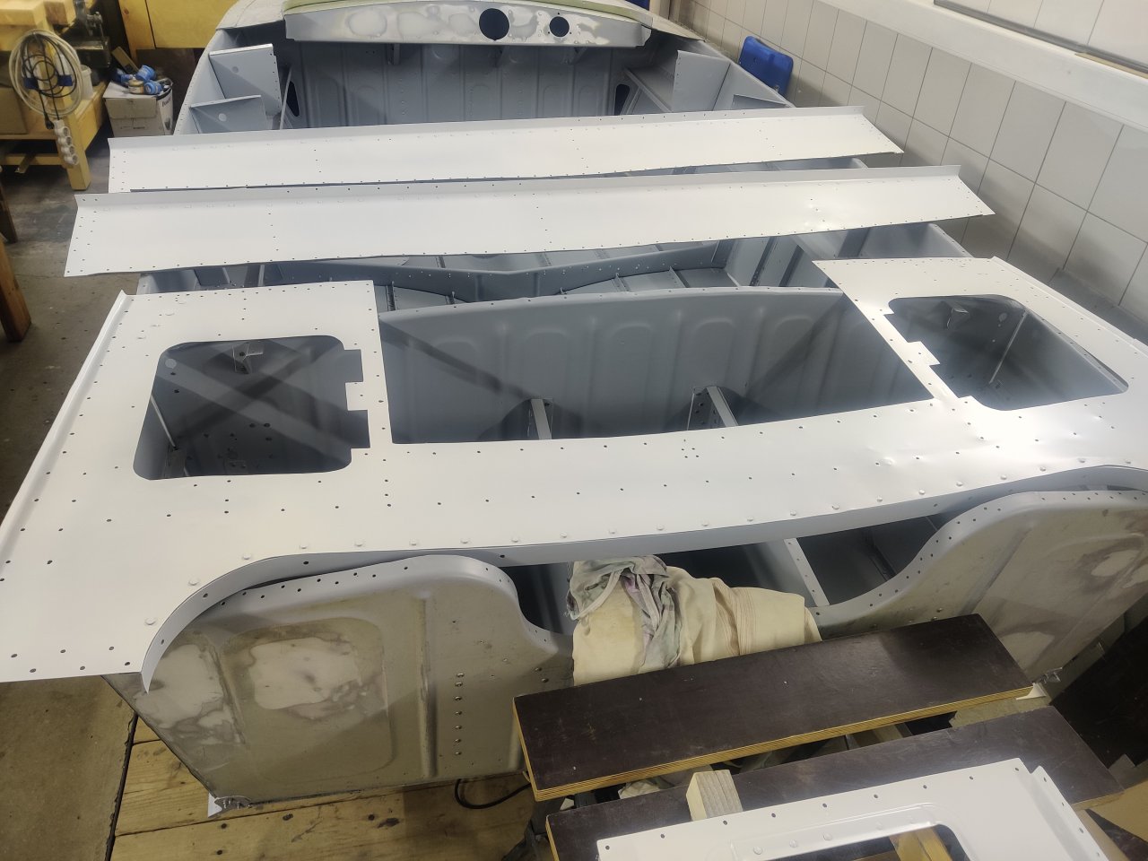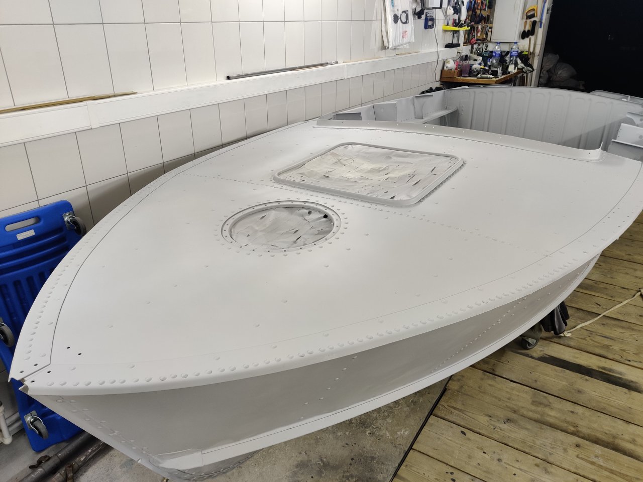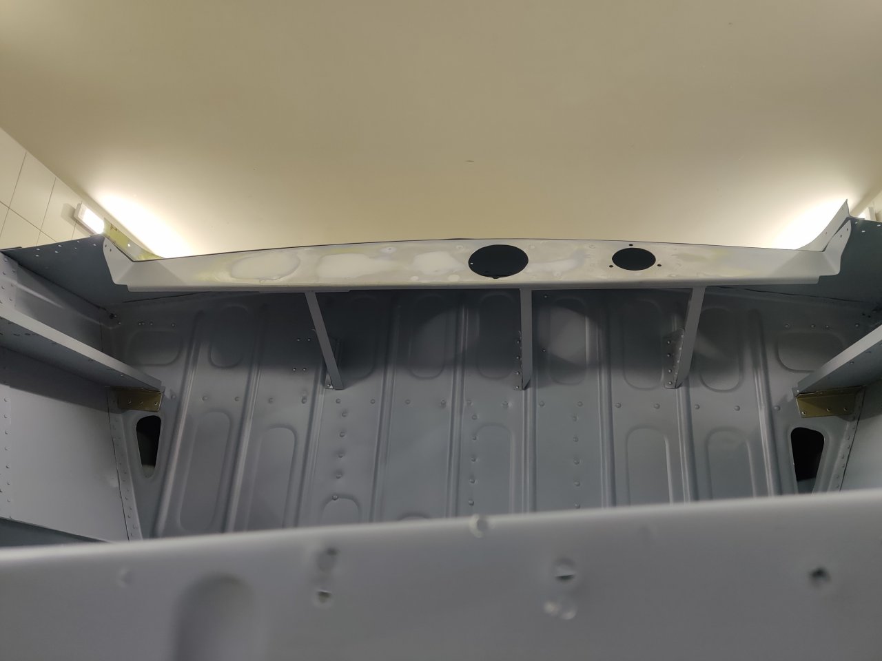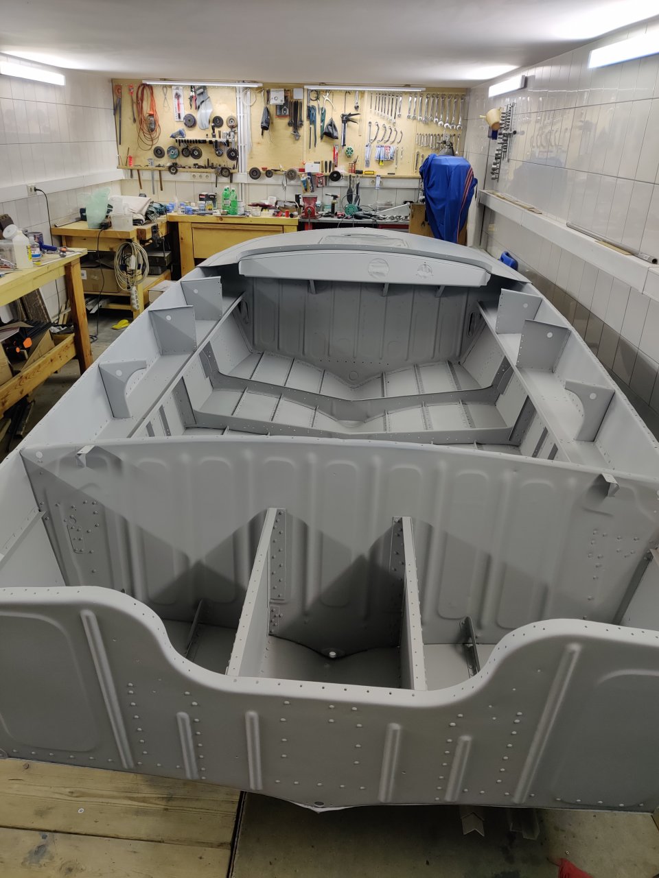 Чуток поработали. Косынки и кронштейны на местах, окрашены предсборки и элемены изнутри. ЭП шпаклся классно держится, на фото видно, как заклёпки вогнаны в нее, но слой очень тонкий. Краска Polimer Marine, ,ПУ, она матовая на их же ЭП грунте.