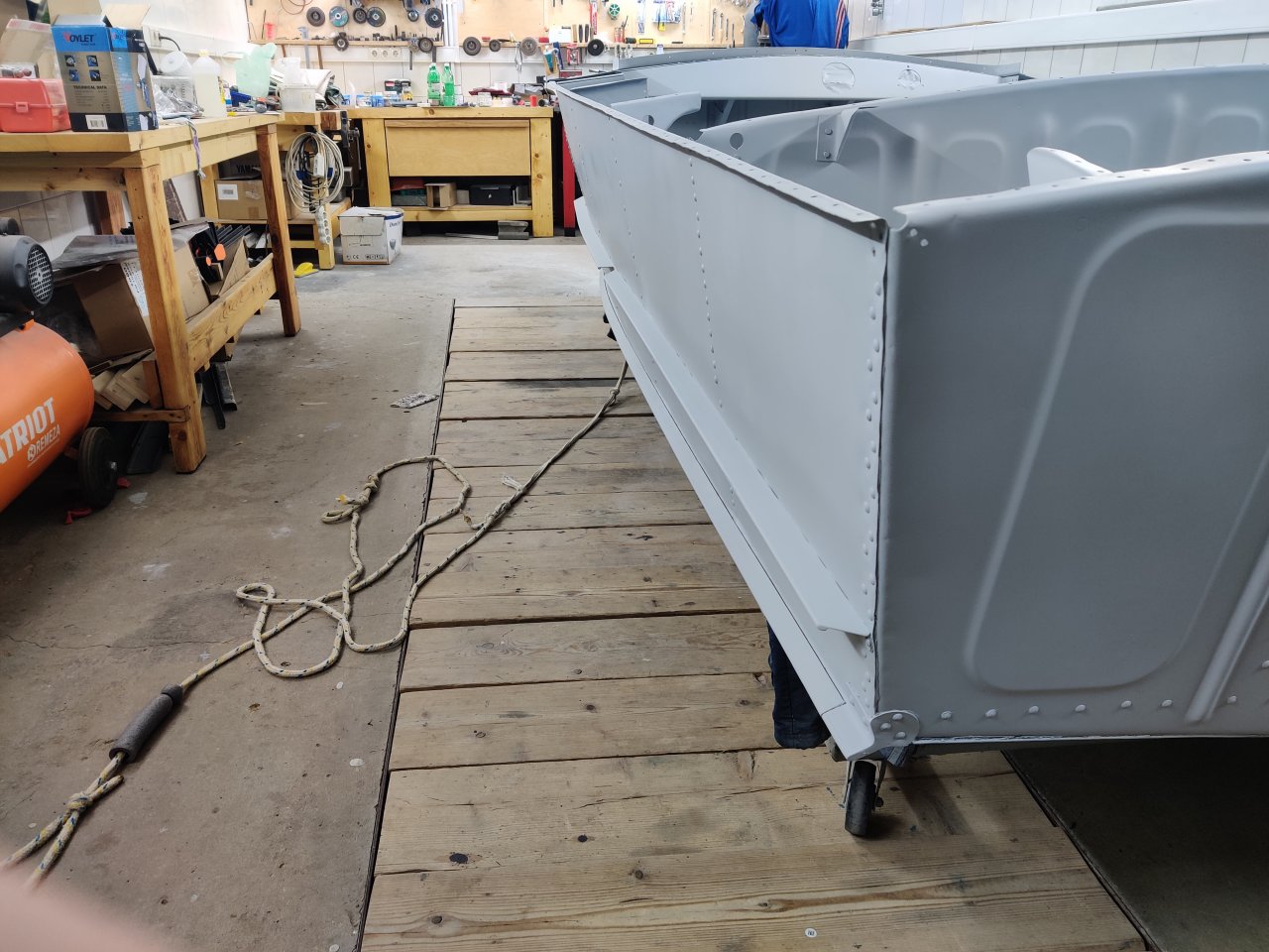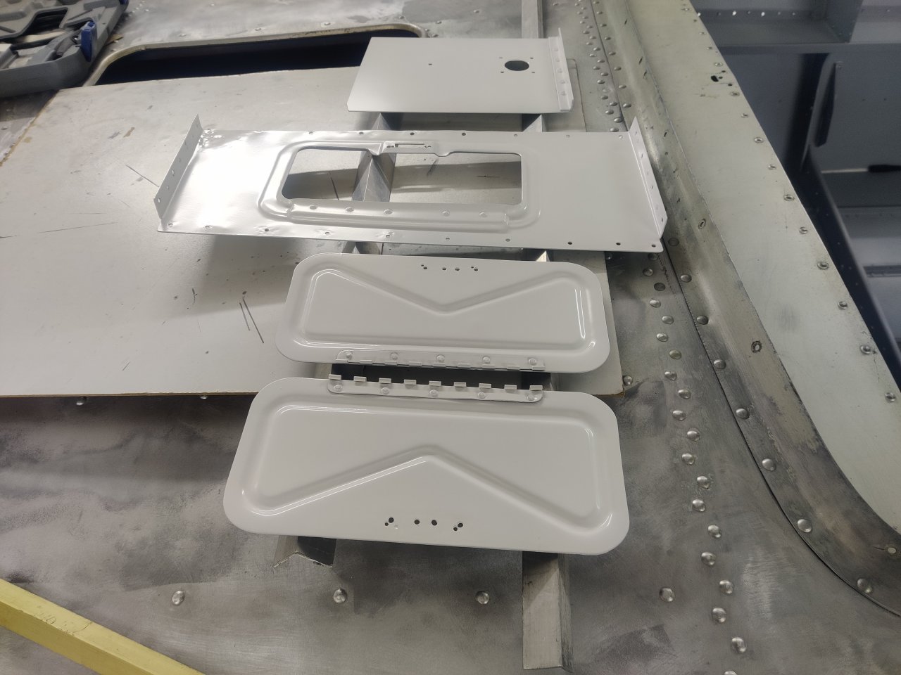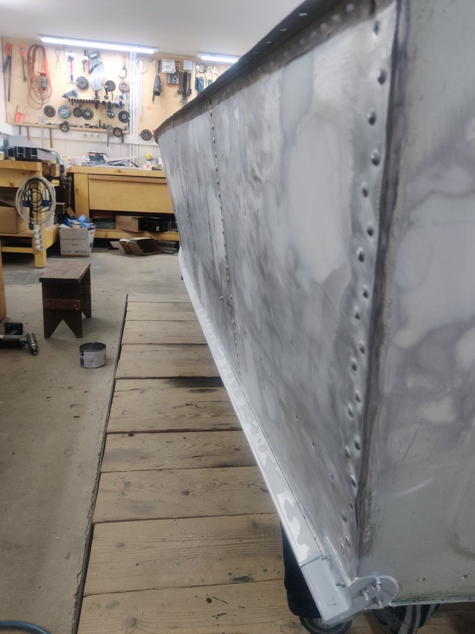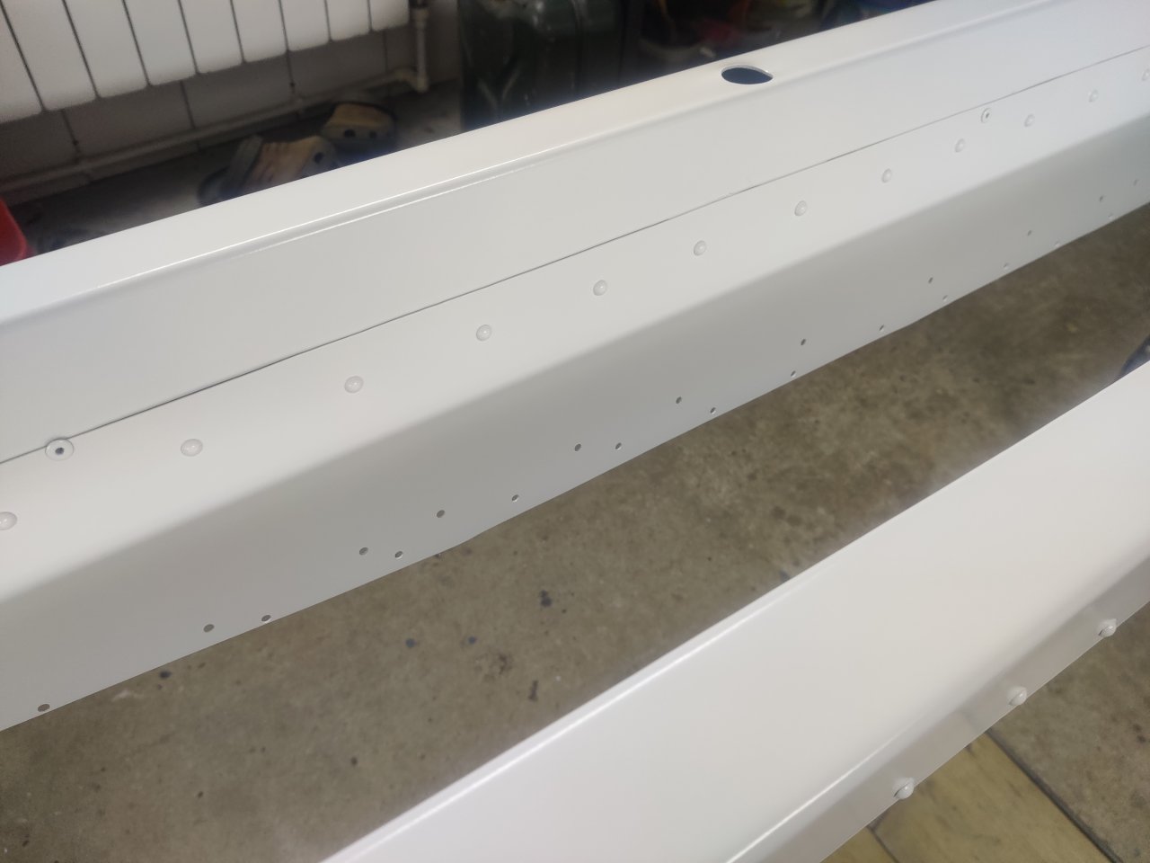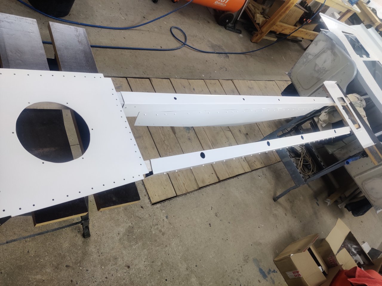 Чуток поработали. Косынки и кронштейны на местах, окрашены предсборки и элемены изнутри. ЭП шпаклся классно держится, на фото видно, как заклёпки вогнаны в нее, но слой очень тонкий. Краска Polimer Marine, ,ПУ, она матовая на их же ЭП грунте.