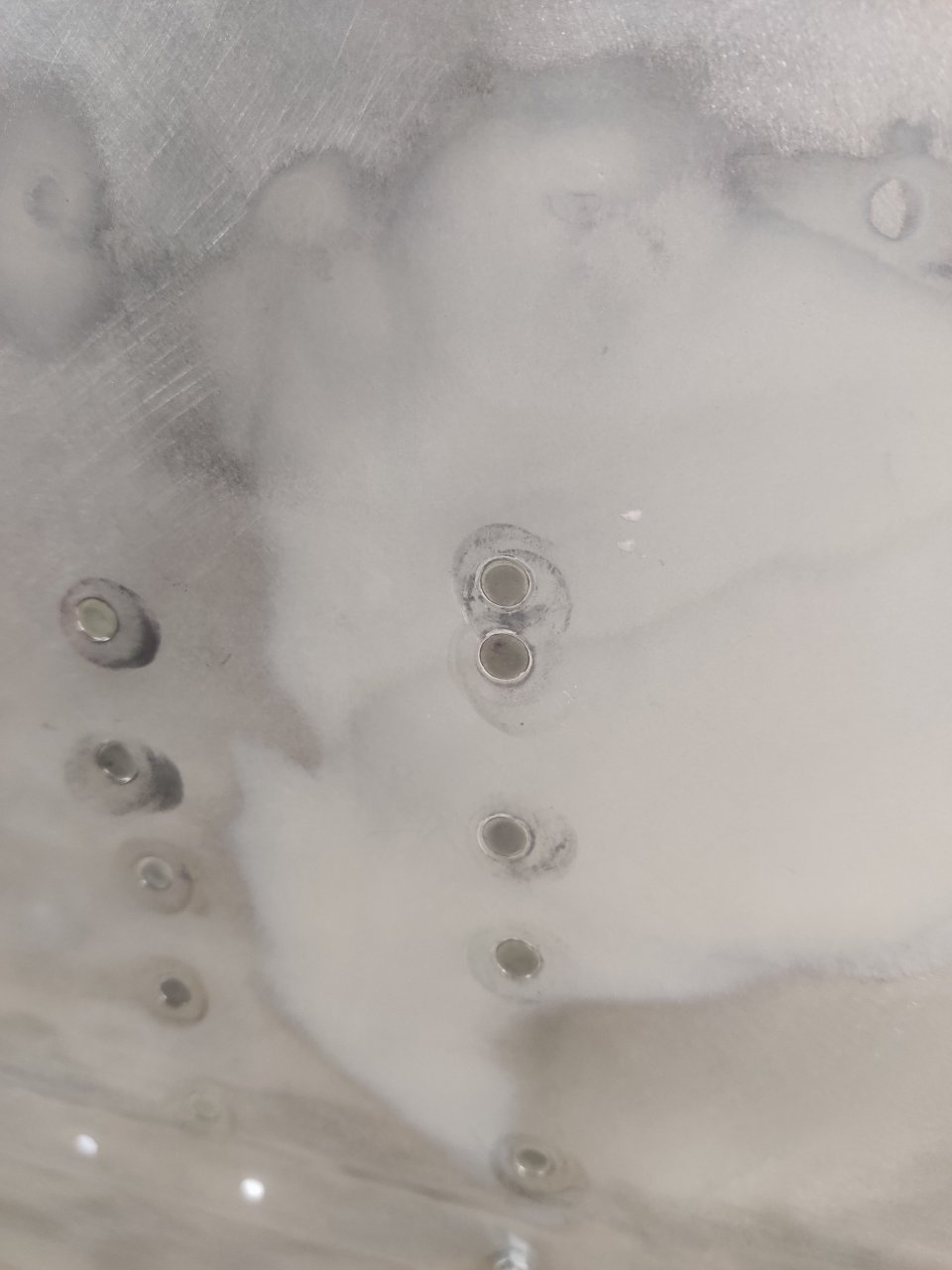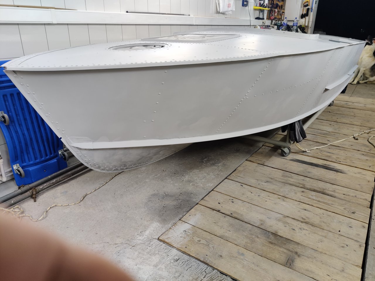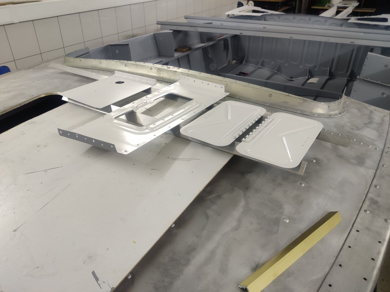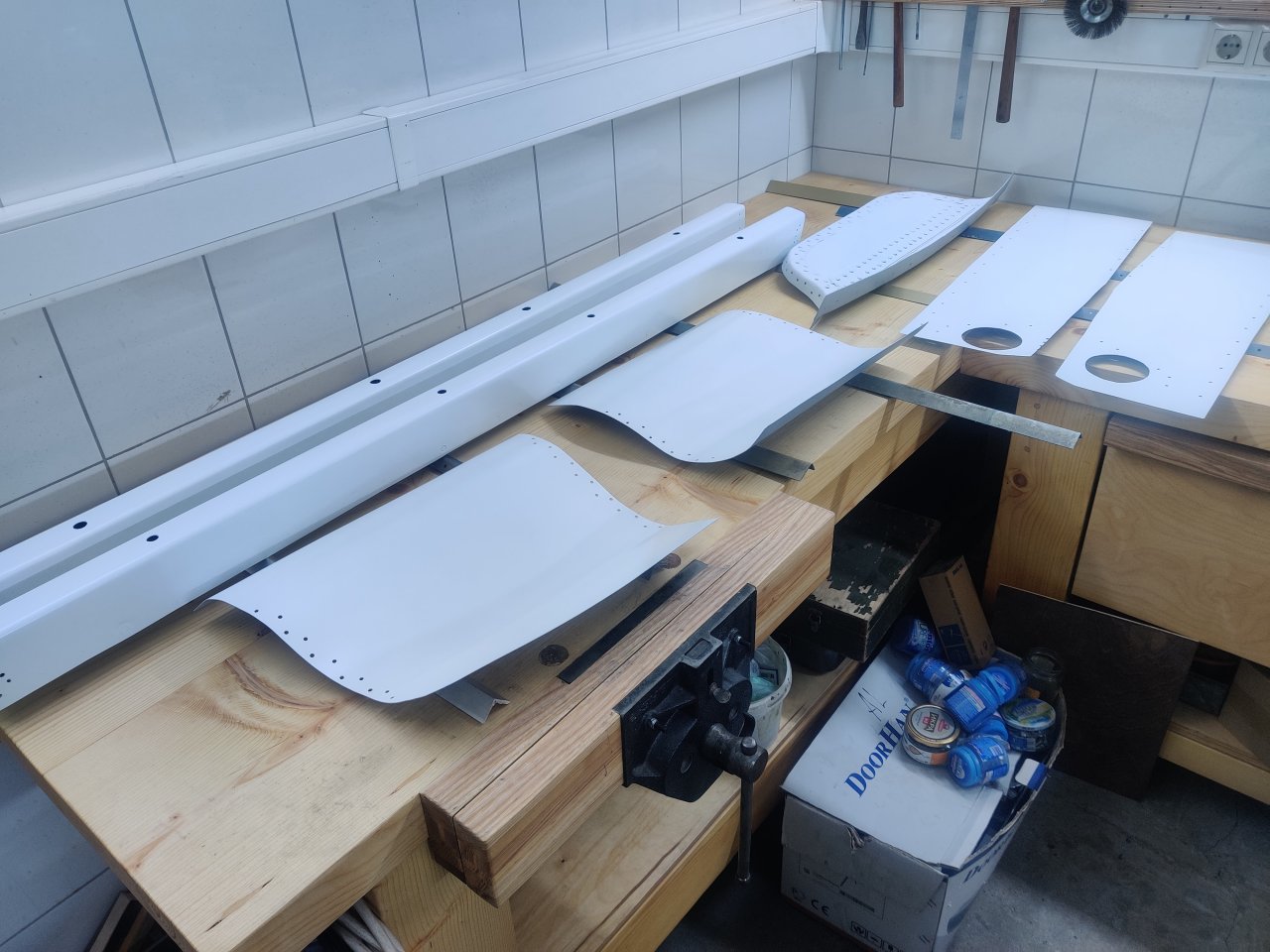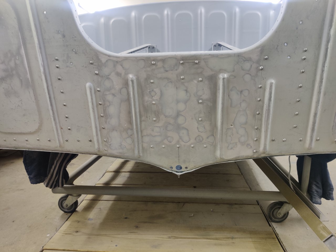 Чуток поработали. Косынки и кронштейны на местах, окрашены предсборки и элемены изнутри. ЭП шпаклся классно держится, на фото видно, как заклёпки вогнаны в нее, но слой очень тонкий. Краска Polimer Marine, ,ПУ, она матовая на их же ЭП грунте.