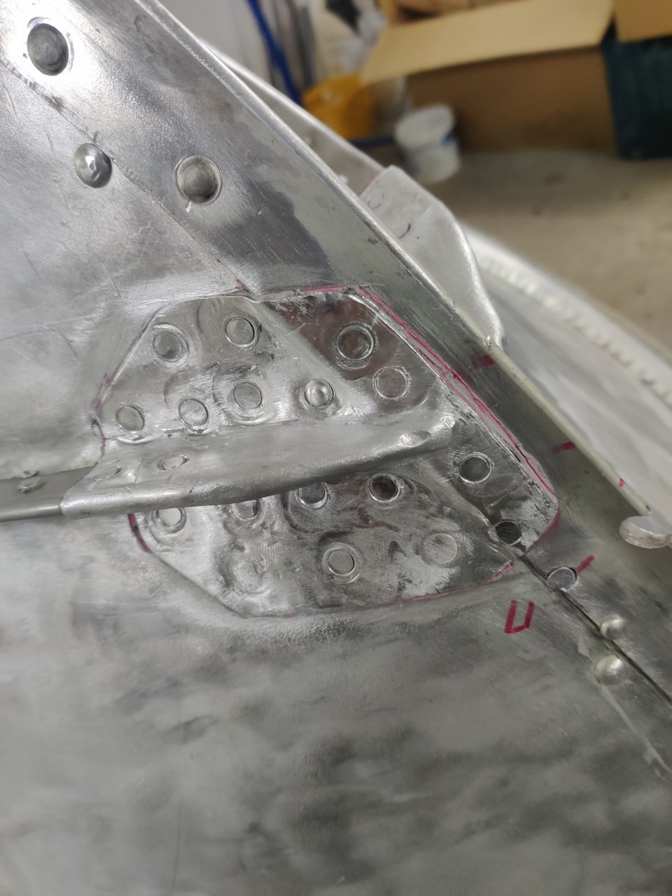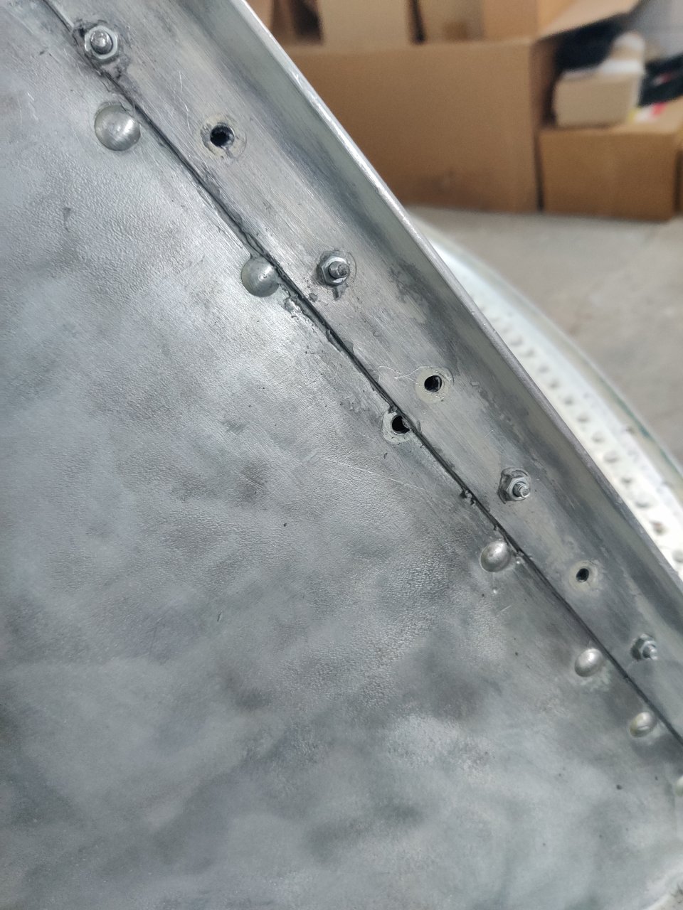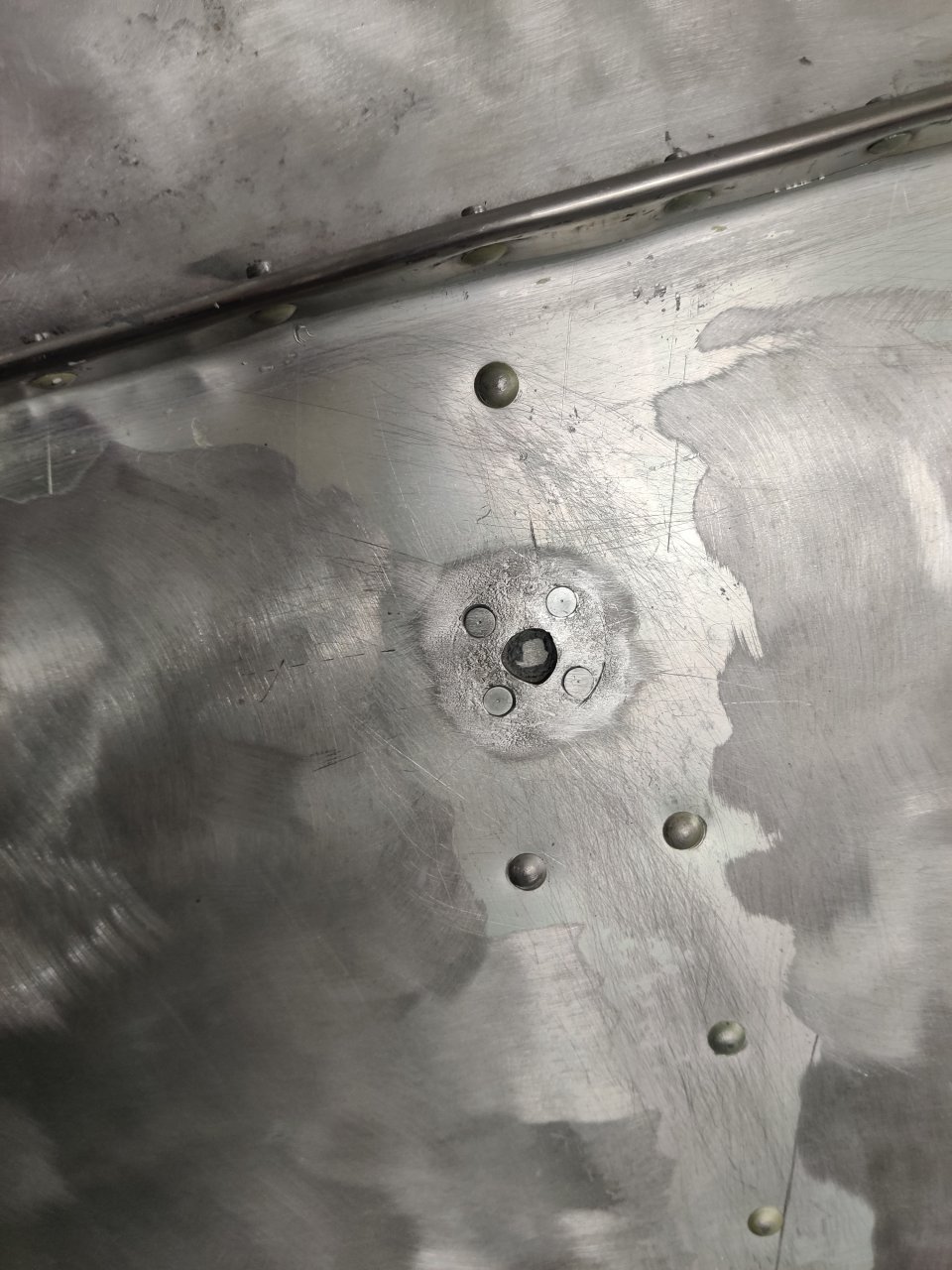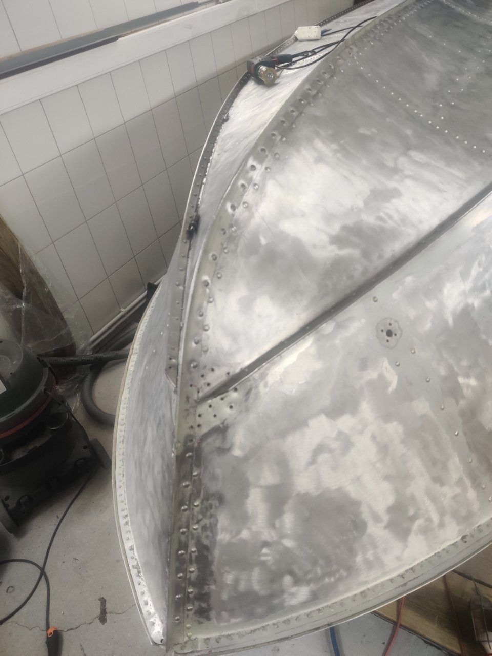 Когда Гриха ставил киль, поспешил и нанес герметик. Я когда излишки снимал уже с и частично прибитым килем, увидел. Туда надо было пару потаев вбить перед установкой. Сейчас есть два отверстия практически вплотную к килю. Думаю забить туда мягкие заклепки, кромку киля дремелем подрезать,чтоб головку сформировать и на этом остановиться.