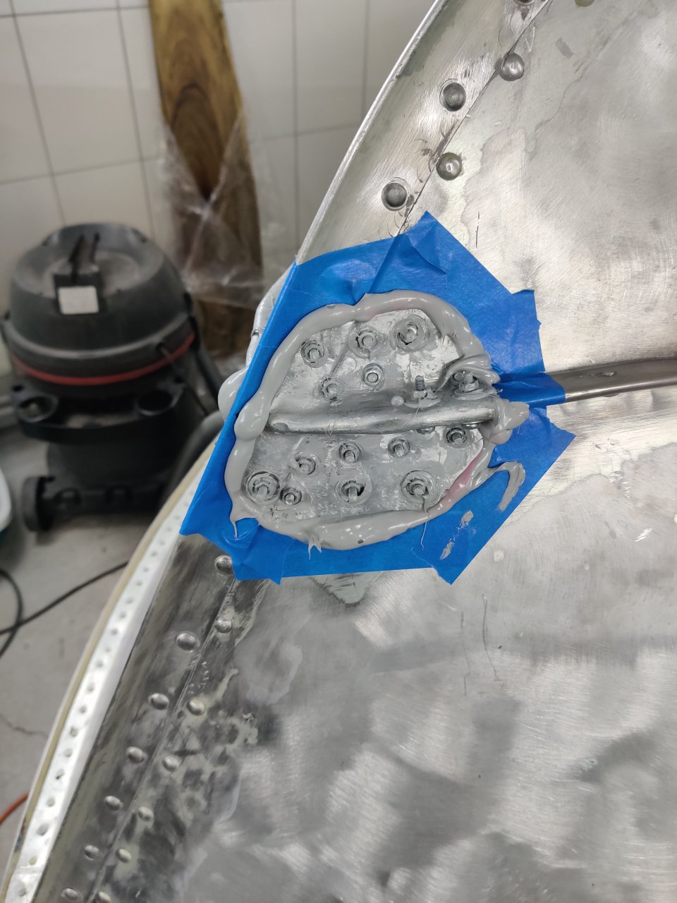 Нанесем герметик, стянем на болты и заклепаем.