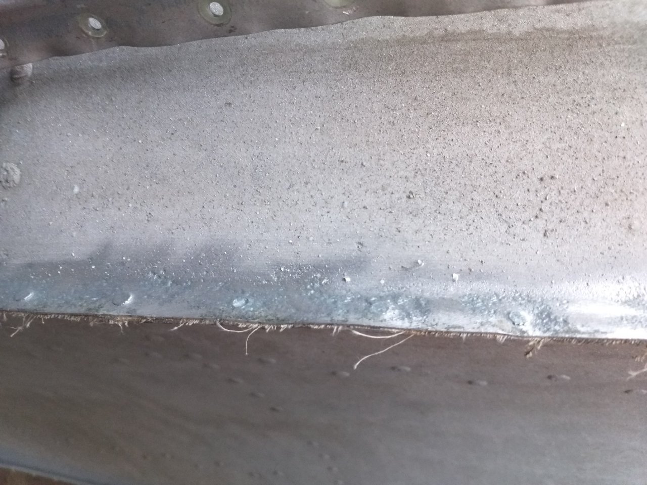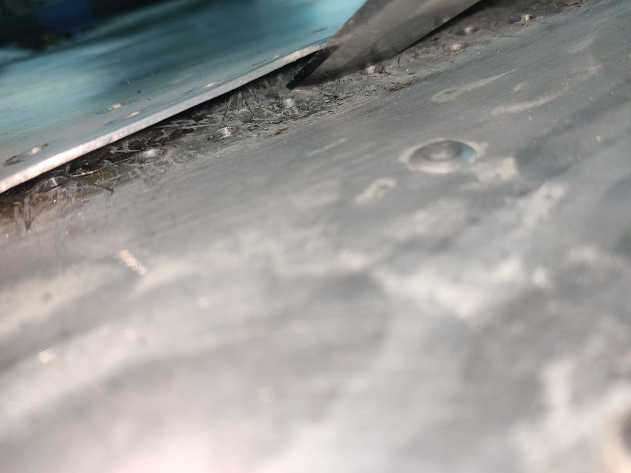 Расстыковали листы днища и носа. Там все замазано краской, лента от балды. Пакет клепали не стягивая, поэтому заклёпки начало плющить между листами. Учитывае возраст - 100 процентов потенциальная течь.