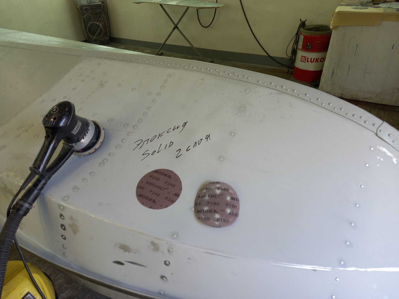 После того как шпаклевка перетерта, грунтуем : эпоксидник (версия мокрый по мокрому) и через час еще два полных слоя акрилового грунта. После сушки акрил перешлифовываю под эмаль