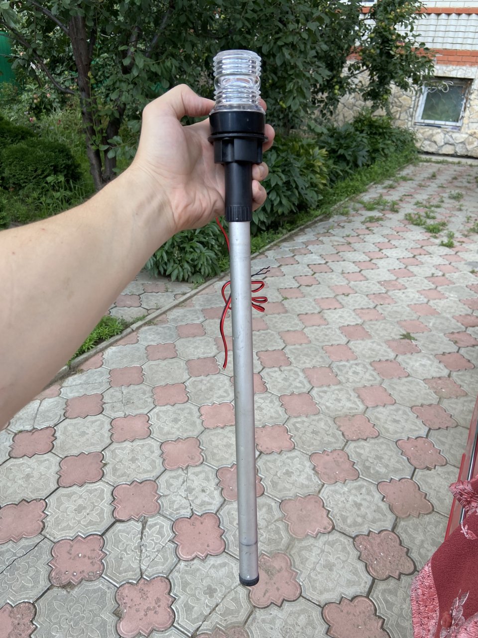 По электрике я сам докупил провода + клеммы для аккума и сделал топовый (клотиковый) огонь. Приобрел плафон с галогеновой лампочкой (900 руб). Ну а над дальнейшей реализацией пришлось пофантазировать. Нашел обломок садовой метлы. Соединил его с плафоном пластиковой мебельной ножкой и завершил все это штекером прикуривателя (140 руб). Дальше еще интереснее. Для фиксации к стеклу, использовал крепление для лейки душа, купленной случайно в Ленте (20 руб). Авось подойдет. А оно как там и было.