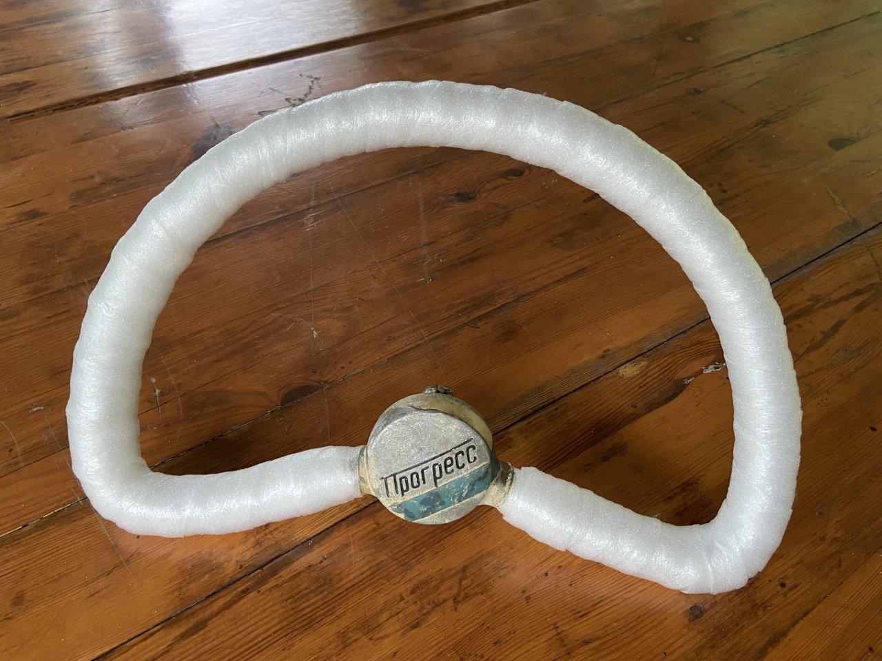 Итак, лодка дома. Кроме покраски и стекла, установили бортовые огни, кормовой огонь, помпу, выключатель массы, пульт управления и проводку. Т.к. штурвал у меня с левой стороны, пилить панель под пульт не стали. Оставили запас длины проводки, чтобы можно было его разместить по левую руку, или же под правую, если когда-то перейду на новый мотор. Что касается салона, или если правильно выражаться кокпита, то он остался почти без изменений и требовал восстановления. Родной штурвал оплавился от солнца, сохранив только центральную часть с надписью "Прогресс", поролон под штатным дермантином рассыпался. Сохранились только слани, т.к. хранились отдельно. Восстановлением кокпита я решил заняться самостоятельно, по мере появления свободного времени. Все-равно на воду мне не скоро. Документов мне было еще долго не видать.