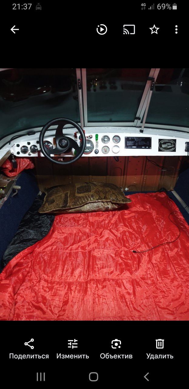 Всем привет. Продолжаю готовить к лодку, в надежде открыть сезон 22) В качестве временного решения - на слани кинул по икеевскому коврику. В родной дермантин вложил кое какой поролон. Штурвал. Штурвал сильно пострадал от солнца и к установке был не готов. В замен ему, приложив имеющийся в наличии автомобильный руль, понял, что ну никак он сюда не подходит и я хочу оставить Прогрессовский. Накидал на него шпакли, обмотал утеплителем для окон из фикс прайс, чтобы придать равномерности и толщины баранке. Обшил заготовкой для рулей с маркетплейса. Центральную часть решил оставить в текущем состоянии, чтобы через нее передавался антураж Прогресса, сквозь года. Мотор. Мотор имел окрашенный колпак и облезшею ногу. Посоветовали - "хоть с баллончика пыльни, чтобы сезон открыть при параде". Так и сделал. Подкрасил, повесил, подключил, заправил. Вроде готов!