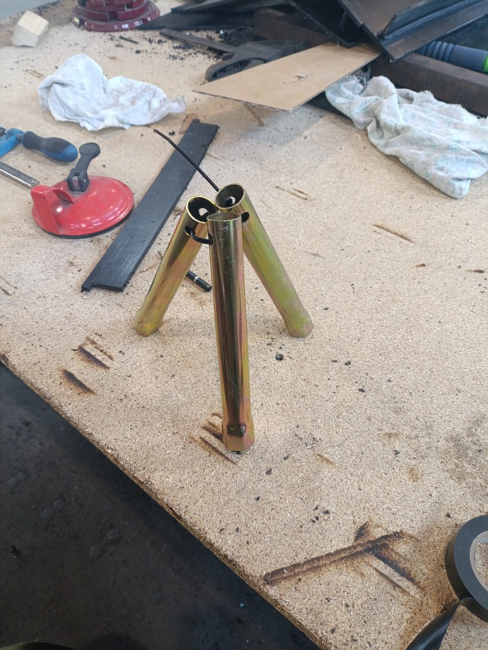 Собери вот такую"макушку" в неё будешь вставлять трубы и за неё же тальку цепляйЕще спрошу. Надо в деревне много пеньков от деревьев корчевать. Таль тоже цепная и тоже шестеренная есть. Остановился на треноге из труб. Трубы тоже толстостенные есть. Не могу принять решение по узлу крепления вверху трех труб и тали вместе. На металлоломе уже купил фланец толстостенный с отверстиями под болты. Думал три трубы вместе вверху них фланец, под него таль,а чтобы трубы не разьезжались в отверстия фланца арматуру. Но неполучается. С треногой, потому что треногу быстрее переносить от пенька к пеньку. Подобное не делал?