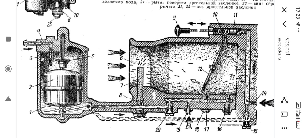 Топливо из поплавковой камеры проходит через дозирующий топливный жиклер системы холостого хола-20, далее подмешивается с воздухом, через воздушный жиклер-19 и через всасывающее МАЛОЕ отверстие(по сути дифузор) всысывается за закрытую воздушную заслонку в камеру 13, где создается разрежение. При небольшом открытии заслонки, приоткрывается БОЛЬШОЕ отверстие (дифузор) холостого хода, чтобы увеличить количество поступающей смеси и избежать провала между холостым ходом и рабочим. Таким образом , воздух дозируется воздушным жиклером холостого хода, топливо дозируется топливным жиклером холостого хода, величина разрежения (скорость всасывания топлива в еденицу времени) определяется только за счет плотности закрытия воздушной заслонки и регулируется упорным винтом на рычаге привода газа. Топливо всасывается через малый и болтший дифузоры на режиме ХХ и переходном(между ХХ и рабочим)