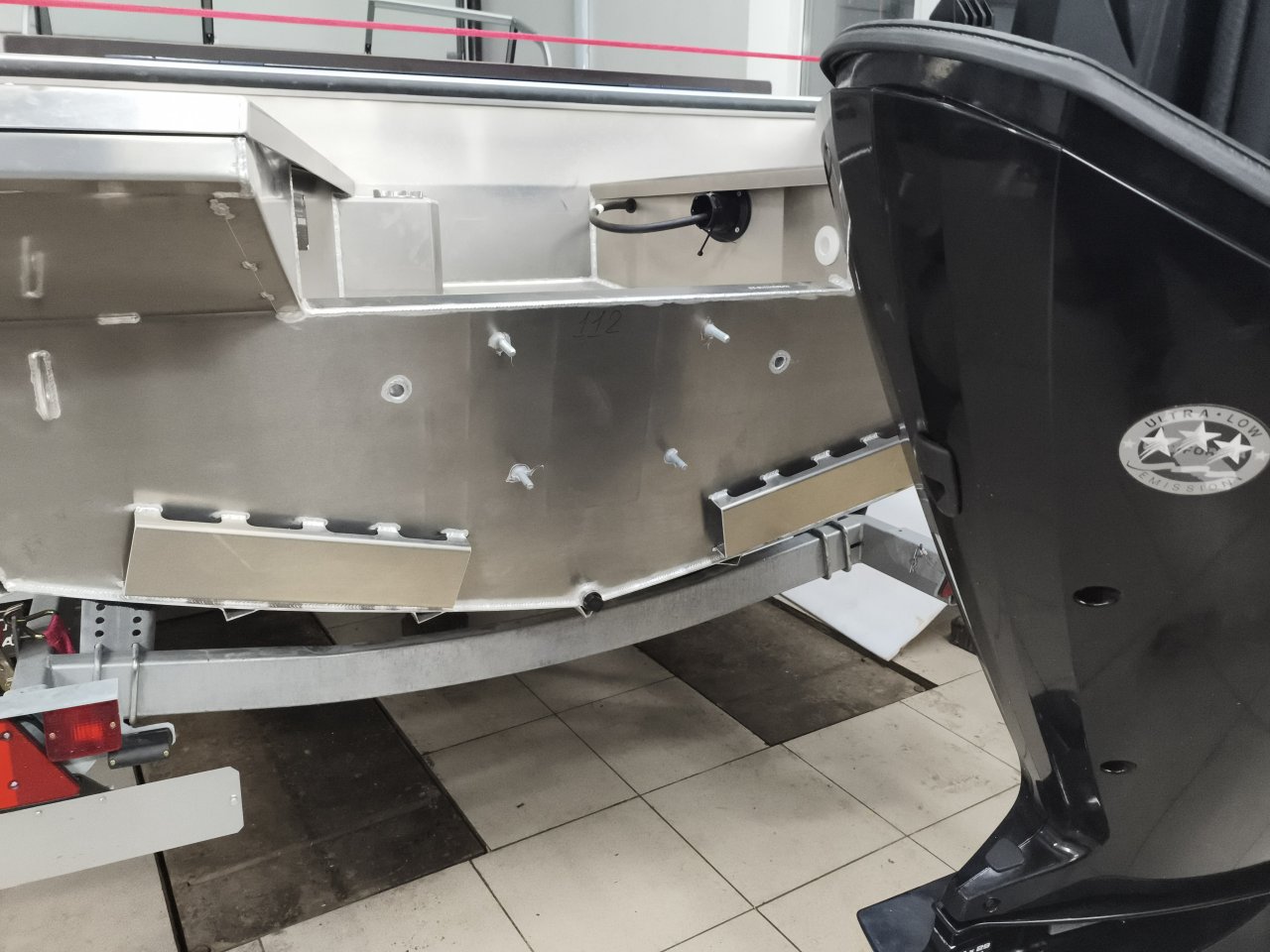 Мотор пришел на раме, раскидал обрешётку, разобрал раму, гусём для снятия автомобильных двигателей вывесили вертикально моторчик. Заранее высверлил транец, промазал герметиком отверстия, приготовил болты м12 х 120 мм от подвески АвтоВАЗа, но в ходе навески обнаружились болты опорных элементов VAG, у них прочность 10.5 и пластичность как у нержавейки. Использовал транцевую накладку с нулевым наклоном.