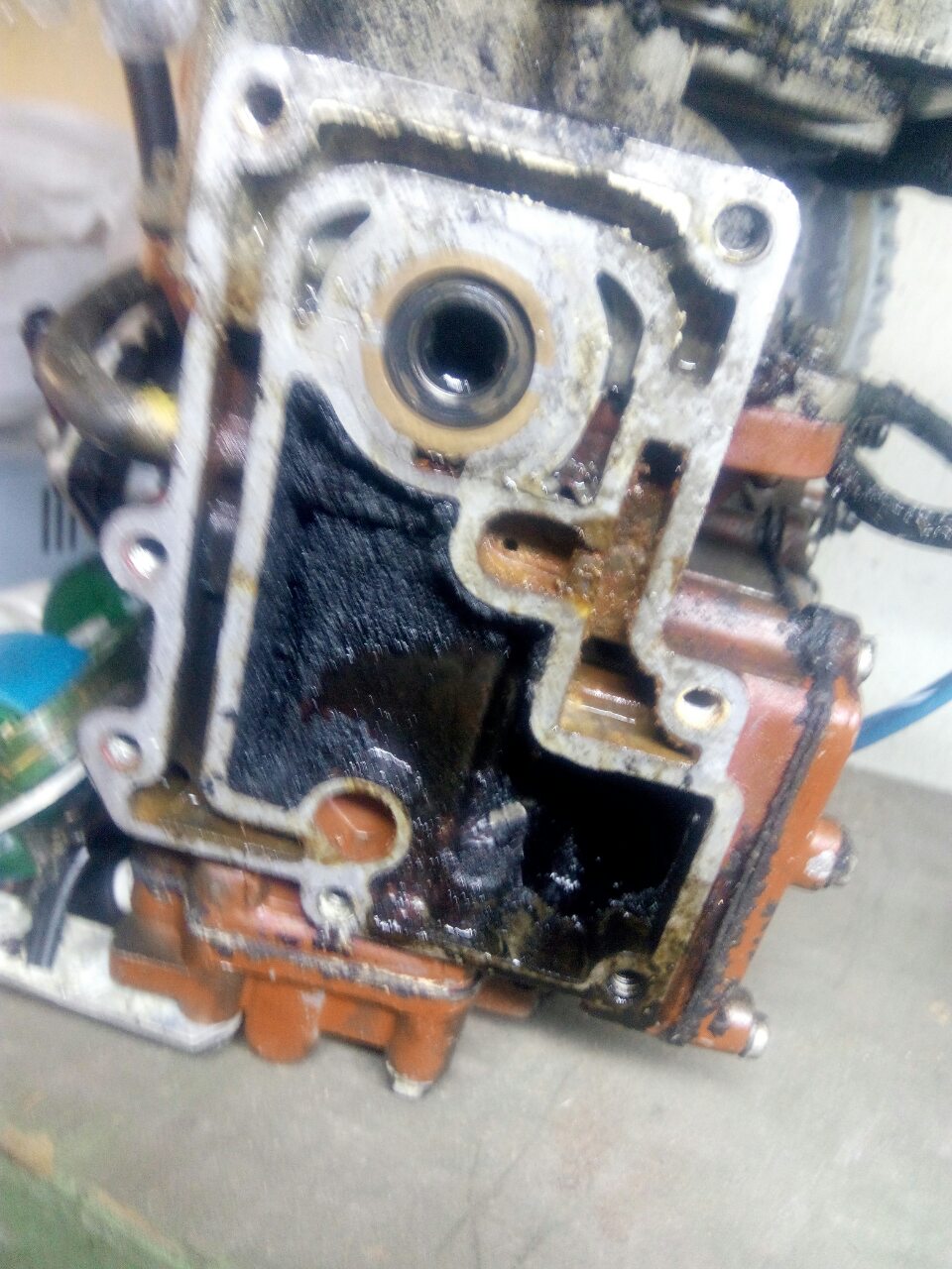 Сегодня расколупал свой мотор почти полностью. Причина не радостная - уронили мот при перевозке в Польше, в следствии треснутый колпак, немного треснул поддон и слегка деформировлся, а как в следствии выястнилось, то еще досталось креплению румпеля -одно ухо треснуло (товарищ Бог аргонной сварки, сказал что исправит) и вот вскрытие показало дикий сажевый налет внутри дейвуда ( на фото ) и неплотное прилегание прокладки (все винты были ослаблены) в районе коленвала (маслом забрызгана нижняя часть стартера и провода катушек. Когда вскрывали мотор товарища, там было все сухи и красиво, а у меня просто мхом черным покрыто... - В следствии чего мог образоваться такой дикий налет?