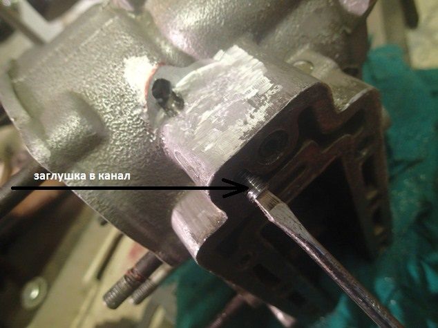 Сначала вскрыл канал соединяющий рубашку цилиндров и часть рубашки глушителя и бормашинкой сделал площадку для термостата. В канал вкрутил заглушку.
