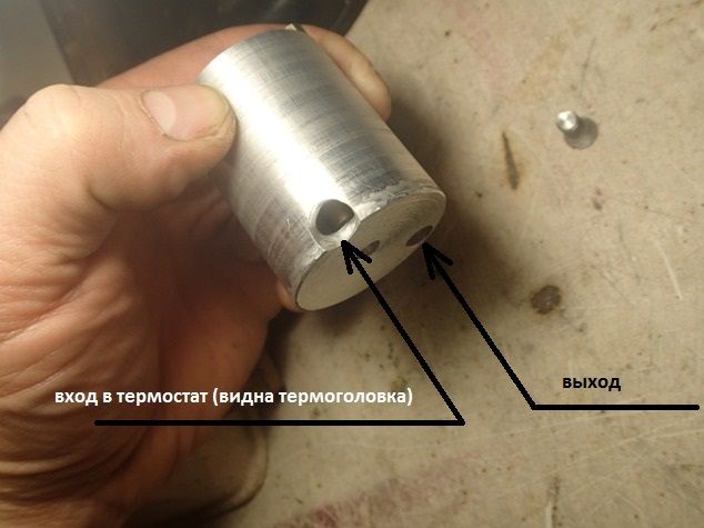 Сделал новый термостат. Корпус выточил из алюминия (или сплава какого-то) и установил сверху на блок цилиндров, прикрутив винтом к блоку вместе с "холодной сваркой" для герметичности. Сначала хотел приварить аргонно-дуговой сваркой, но блин своей нет, а куда-то тащиться приваривать да ещё в прздники........ Но лучше всёж приварить по настоящему, что бы было одно целое.