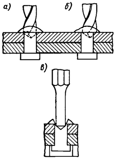 б — неправильный способ засверливания; в — удаление заклепки при помощи пробойника и кольцевой поддержки.