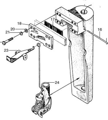 Влючать задний ход надо осторожно, на самых минимальных оборотах ХХ. Защёлка ( дет. 16, 23, 24) должна удерживать мотор от откидывания при запуске и включении ЗХ и одновременно давать мотору свободно откидыватся при наезде на препятствие, что-бы не повредить мотор и транец. Посмотрите, нет ли каких механических повреждений на деталях защёлки, не выгнулась ли нижняя стальная пластина между струбцинами, за которую цепляется защёлка. Возможно сжалась пружина защёлки (на детали 24). Сжатую пружину можно попробовать немного растянуть, учитывая вышесказанное.