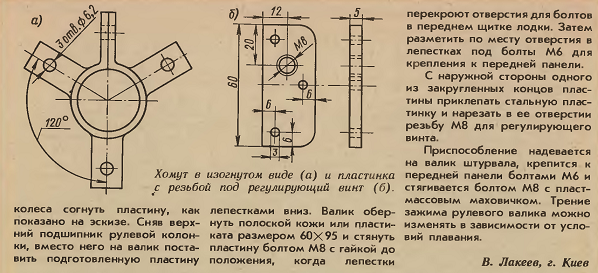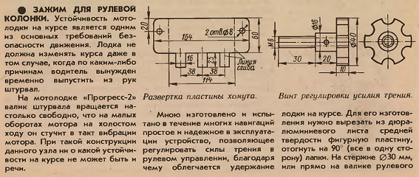 Это верно, когда идёт сквозная намотка штуртроса на рулевой барабан, здесь в принципе можно обойтись и одним натяжным устройством. На Прогрессе штуртрос закреплён на барабане, и у каждой ветви троса своя натяжка талрепом или пружиной. Для повышения устойчивости Прогресса на курсе можно сделать рег. зажим рулевого вала.