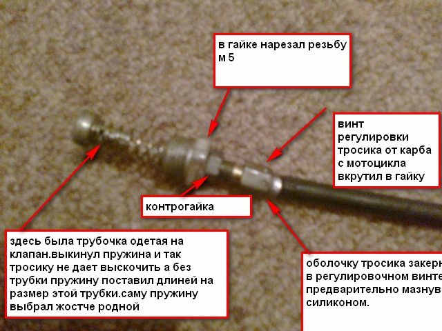 При длительной эксплуатации некоторые детали подсоса выходят из строя. Мотор эксплуатируется в среде с повышенной влажностью воздуха, а бывает, что необходимо пройтись без капота, тогда на него летят брызги, может плеснуть вода (в экстремальных случаях) и т.д. От присутствия влаги ржавеет не всегда хорошо смазанный тросик и его боуден (кондуит). Лопаются возвратные пружинки, и отваливается шарообразный наконечник троса. износ троса сопровождается переломом проволочки и подсос начинает "заедать", а то и вообще остается открытым. В таких случаях он исчерпал свой ресурс и подлежит замене. Но можно его и отремонтировать. Тросик д.1мм выпаивается из манетки и заменяется на новый (стоит копейки) и впаивается в подвижную часть манетки. Его наконечник делается из олова паяльником, предварительно хорошо обезжиренный. Боуден навивается из проволоки д.0,7-0,8мм дрелью на ровной оправке-проволоке д.1,5мм. На его концы вставляются латунные наконечники, снятые со старого боудена (они накручиваются, поэтому направление свивки нужно делать, как у старого). Длину троса необходимо делать как у старого: если сделаешь более короткую, то клапан, вроде закрытого подсоса, может быть не герметичен. Лопнувшие пружинки подлежат замене. При сборке всего механизма подсоса на трубку д.8мм подсоса необходимо одеть полихлорвиниловую трубку, являющуюся электроизолятором, ввиду непоследственной близости токопроводящей части (клеммы) электростартера: может коротнуть. И обильная смазка, чтобы весь механизм ходил легко без малейших заеданий. Боуден, у правильно собранного подсоса с нужной длиной тросика, при закрытии должен не доходить до гайки (которая вкручивается в отверстие карбюратора) 1-2мм. Тогда будет 100% гарантия, что подсос хорошо закрыт.