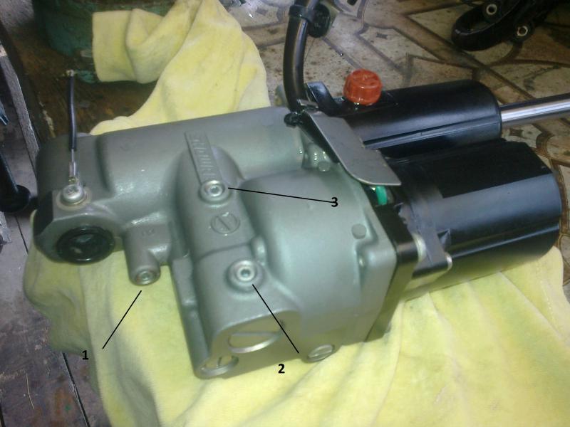 Приветствую вас! Помогите советами. Лопнул пластмассовый чёрный маслобак на сервоприводе Хонда 50 (2012 г.в.), точнее после обледенения мотора отбивал лед, и скорее всего сам сломал :shock: . Масло вытекает при поднятии и опускании мотора. Запчасти уже заказал в интернет магазине, жду. Подскажите как залить туда новое масло, я все слил, выдавил, было с водой. Там три пробки (маленький шестигранник), вроде конусная резьба. На фото отметил 1,2,3. через какую заливать, или через красную, где выйдет воздух, мне бы весь алгоритм действий.? Да и еще, не могу открутить эти пробки, шестигранники ломаются, что сделать (может зубилом :jokingly: )