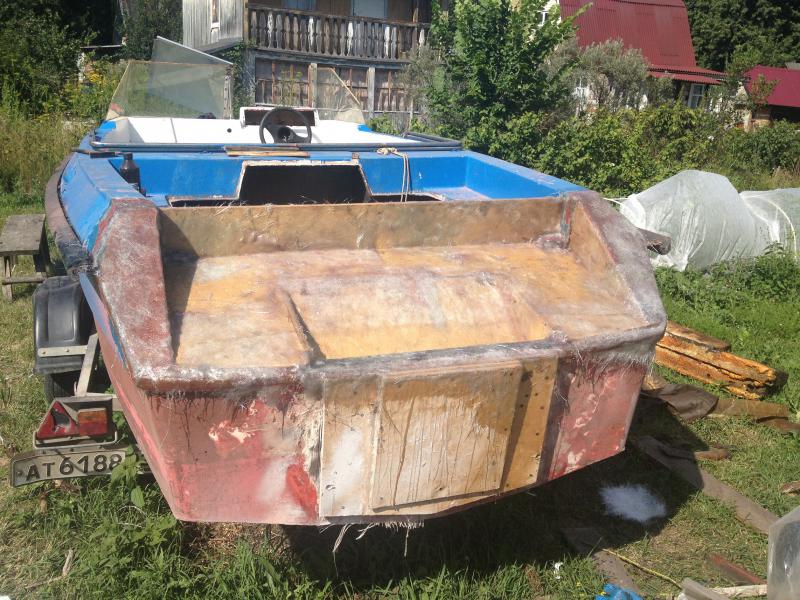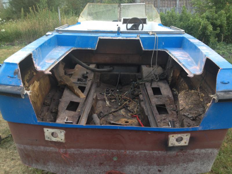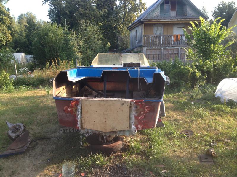 Полный комплект-мотор,вал,руль.После первого спуска на воду было принято решение избавиться от стационара в пользу повесника.Катер был перевезен на дачу,где из него выдернули мотор,гидромуфту,редуктор и вал.