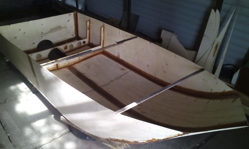 Новую тему открывать не буду продолжу тут. мысля о защите винта присутствует уже давно но воплотить в жизнь получилось только сейчас. до этого конечно были защиты в виде так называемых "коз"-это приблуда сваренная из железяк которая крепится на редуктор мотора. но на тонель все ни как не мог созреть. были у нас люди которые врезали тонели в казанки-южанки но почемуто не получалось у них добиться желаемого результата. поэтому страх что не получится преследовал меня до самого спуска на воду. но после первого испытания и небольшой игры с высотой установки мотора все отлегло. перед тем как решиться на постройку лодки перечитал почти все темы связанные с постройками лодок. так как опыта в постройке лодок у меня небыло. и наконец решился. далее стал выбор проекта но под мои хотелки ни чего не мог найти из уже готовых проектов. и пришлось разработать проект самому. и понеслось. форумы, литература, разговоры с бывалыми. короче старался выбрать все необходимое для себя. потом начались подсчеты примерная стоимость и доступность материалов. после выбор пал на фанеру метод СиС (сшей и склей). ну и с приходом тепла закипела работа.