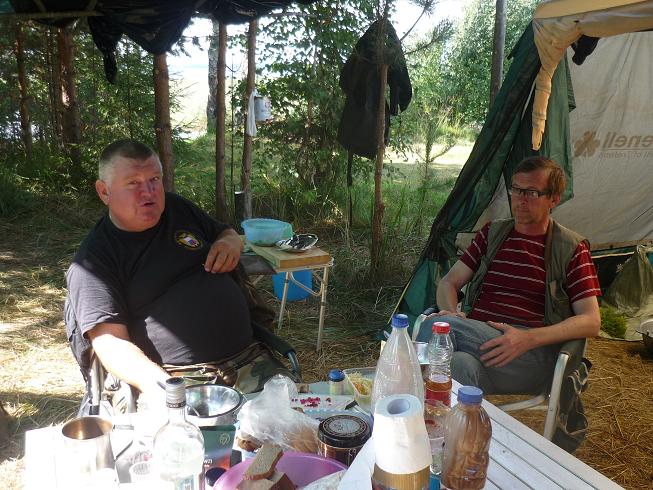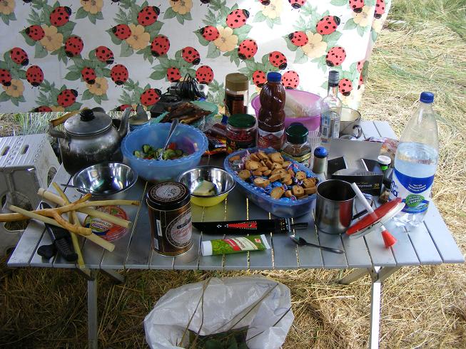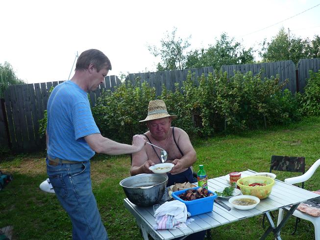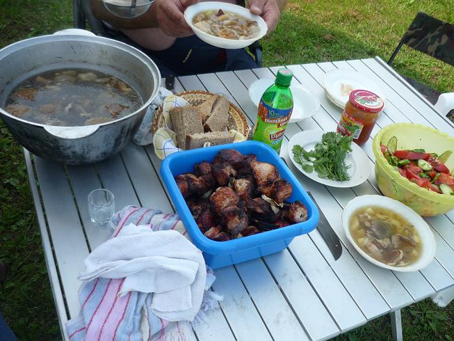 начали ждать третий экипаж на «Таракане», который прикатил к 13 часам. Отобедали, чем Бог послал. Супчик грибной, жареха грибная, шашлык, картошечка молодая, салатик из собственной теплицы, помидорчики. огурчики, перец, чесночек, зелень. Вышли из-за стола не голодными.