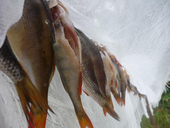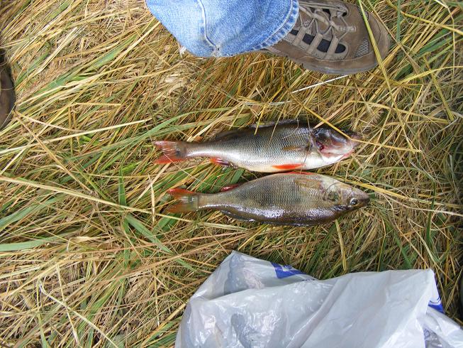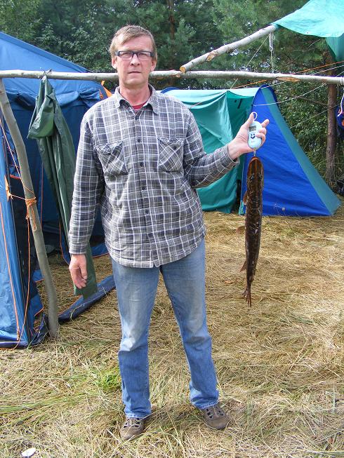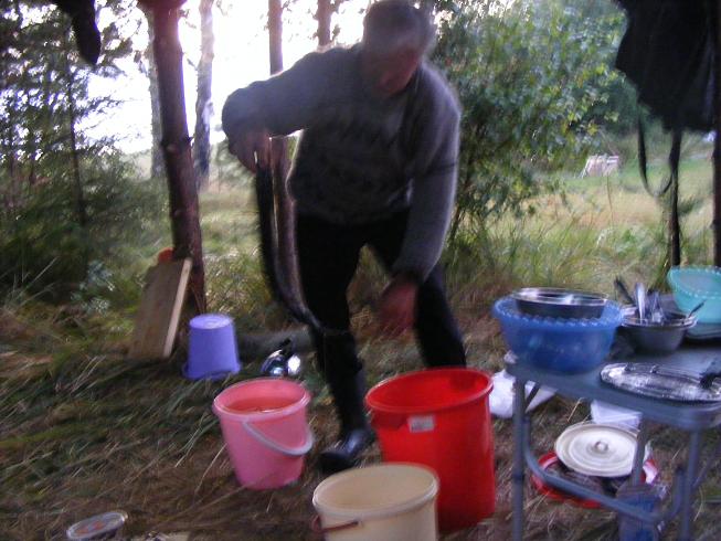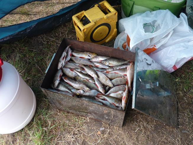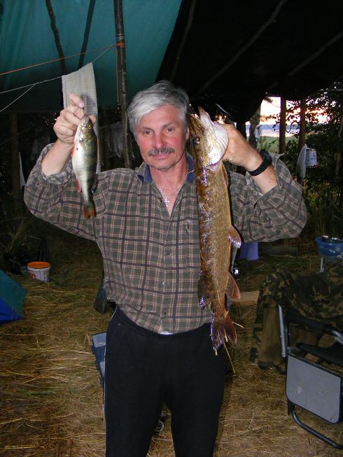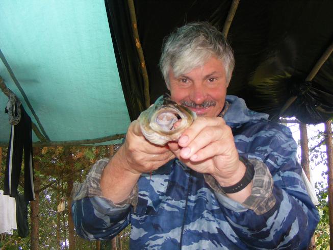 Теперь будем каждый раз ставить навесы на всю поляну, если место позволит? Дождь идет, а ты ходишь, сидишь в сухом, даже сушиться можно. Шатры использовали под кухню и под склад. Вечером, немного полечившись вышли на воду, окушков погонять. И понеслось. Утро-вечер, утро-вечер…. Появилась проблема…. Куда рыбу девать? Брали по три-четыре рыбки, остальных отпускали. Местные ловили на вертухи, а мы таскали крупных и при каждом забросе. За спиной слышал разговор: «Во Ч(М)удак?! Рыбу отпускает?! Совсем эти москвичи зажрались, рыбу не берут!» Сели и сидят, смотрят как я рыбу вытаскиваю и обратно выбрасываю. А невдомек, что на железо окунь в это время плохо клюет, надо «ключик» к нему искать и будешь с рыбой. Брали только от 250… на пожарить и покоптить. Но как поймал так и разделывай.. и сам жарь, а остальные есть будут. Так лучше ее вообще не привозить! Бывало за утро, ведро-два мелочи отпускаешь. Клевала и щука. Наелись досыта!!!!!