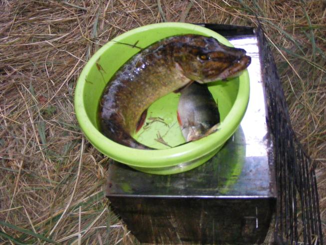 Посидели… Вечером, на Леонидыча «Касатке» вышел на воду, поппер погонять. Пришел на свое излюбленное место, первый заброс и … Бросок… Щуренок на 1250 гр. Но сволочь поппер почти проглотил, пришлось возвращаться на базу. При вынимании поппер был безвозвратно потерян, сломан. Посидели….