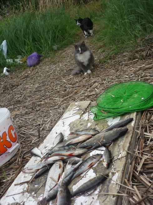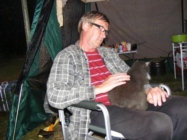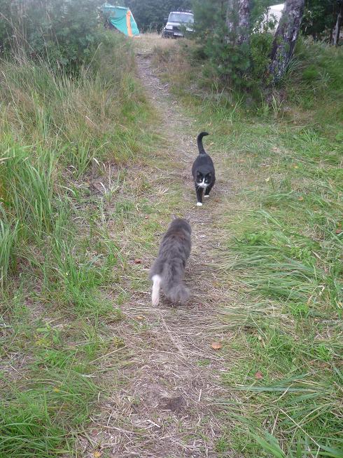 Отдельное слово, про котов. Коты путешественники. До Карелии они скатались в Псковскую область, потом через два дня поехали в Карелию. Коты, которые просидели в московской квартире 13-ть лет, безвылазно, совершили такой вояж. Первым освоился все тот же Филька (погоняло БЕГЕМОТ). Ходил по поляне и местным кустам. Нагло просил пожрать. Научился палатку сам открывать и смываться пока ПАПА на рыбалке был. Через неделю вылез и Марсик. Освоился то же быстро, даже на руки залазить стал. До сих пор кормили их Кити Кэтом, у нас стали жрать и колбасу, и рыбу жареную, и рагу овощное с тушенкой! Если следующий раз поедут, научим макароны есть!