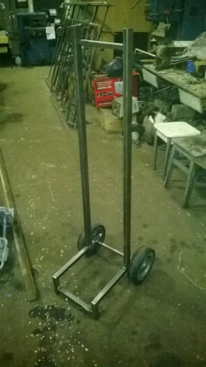 Похвастаюсь и я своей тележкой. Сегодня доделал, осталось покрасить. Тележка устойчивая, легкая, перемещается без проблем по лестнице и земле, песку. Сегодня прошла "ходовые испытания". Высота от пола 1000мм полная. Делал под L ногу. Попалась мне на работе тележка непонятного назначения. Колеса - литая резина, разборные на 204 подшипниках. Вторые колеса не ставил за ненадобностью лично мне. В перспективе эту же тележку доработать для перемещения сварочного полуавтомата и баллона с углекислотой. У меня баллон маленький на 13.4 литра.