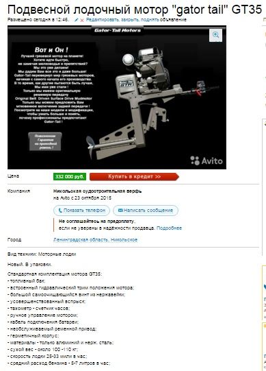Ответ Чемберлену:levinx сказал(а):http://water.drom.ru/kazan/engines/gator-tail-gtr-35l-usa-lodochnyj-motor-vezdehod-39326612.html