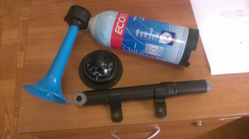 Еще на днях приобрел "Туманный горн" с насосом и компас. Звукосигнальное устройство положено по снабжению а компас просто понравился.