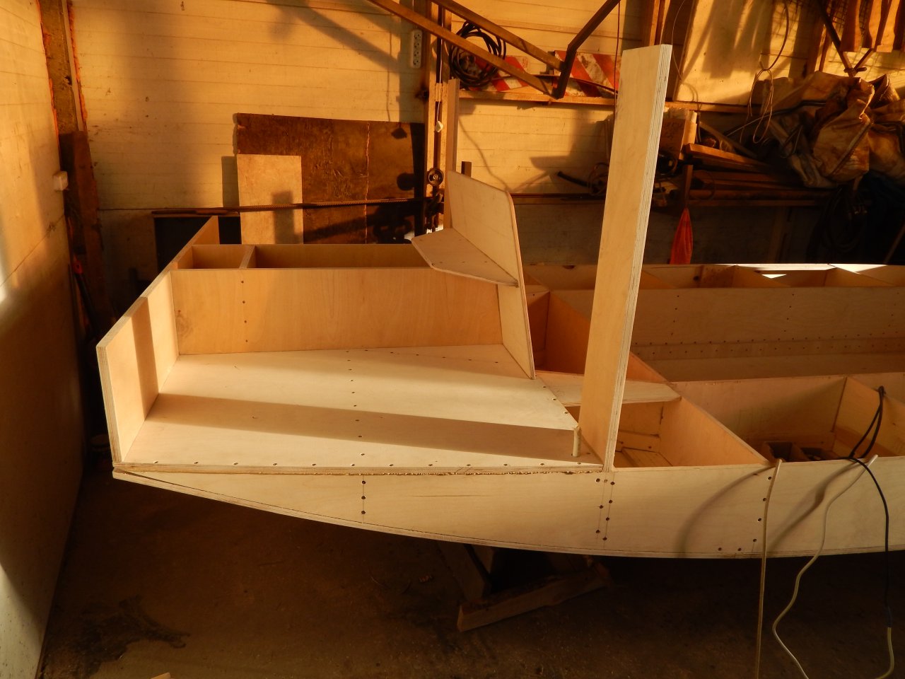 Фанера из магазина ФСФ водостойкая.Клею на жидкие гвозди титебонд.Короче,все как на предыдущем судне.Показало себя хорошо,зачем что то менять.Ну и саморезы 3.5 применяю не черные,а желтые-они чуть мягче.И соответственно сверлю под них отверстия в нижней заготовке 2мм и в верхней 3.5,потай пробиваю керном.