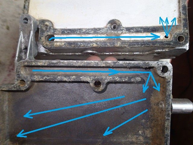 На В-12 тоже есть такие каналы, но они не глухие. Они соединены между собой в глубине, а так же просверлено небольшое отверстие в вертикальный входной канал глушителя и это правильно, т.к. в верхний цилиндр поступает подогретая вода из нижнего, а здесь к ней подмешивается холодная из глушителя. Как результат более равномерная температура цилиндров. Самое интересное, что сначала я ломал голову как подмешать холодную воду к верхнему цилиндру и придумал, просверлив отверстие из канала к одному из глухих карманов. И только потом, разглядывая блок В-12 в гараже увидел, что это уже придумано! Причём точно так же! Во как бывает....
