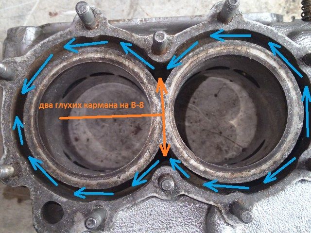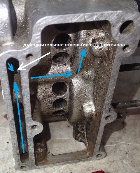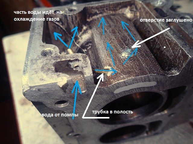 После чего вода попадает в канал головки цилиндров, причем сначала верхнего цилиндра, охлаждая зону свечей.