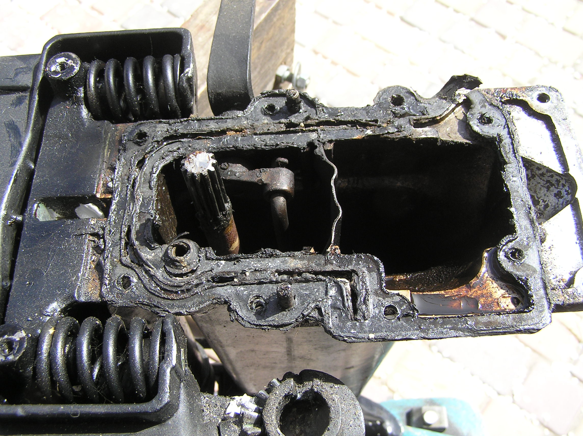 Расколол двигатель, понял почему нет воды из контрольки. Все каналы залиты герметиком, есть и контролька, только забитая. Снял прокладку, естественно она пришла в негодность. Почистил, Заклепал контрольку и просверлил новую в зад и в сторону. Теперь вопрос встал о прокладке, где достать или вырезать из поронита.