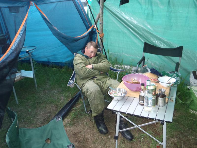Конструкция нашего навеса сохранилась… нам только пришлось немного достроить. Так как пологи взяли 5х6м. Сделали навес, поставили палатки. Спустил лодку. Съездил по воду на дачи ну и,… «приняли…» «С приездом, Гости дорогие!»