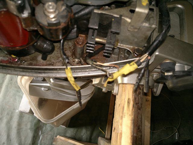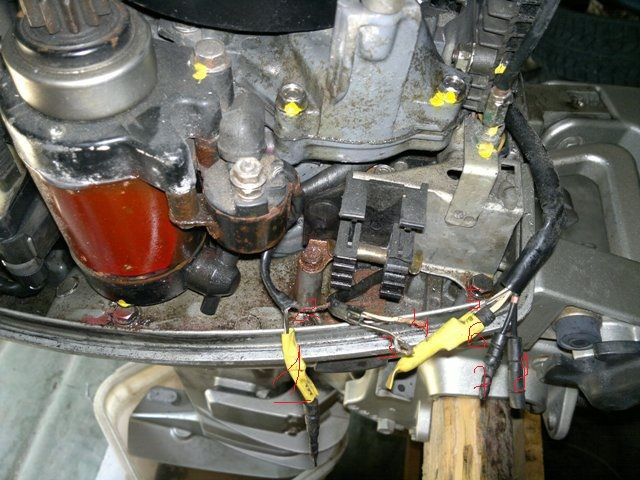 Подскажите как подключить акамулятор к проводке мотора, имеются провода незадействованые на фото. Слева провода со стартера, центр кнопка пуска на румпеле, справа ?. Какие куда соединить? какие к + какие -? Последовательность?
