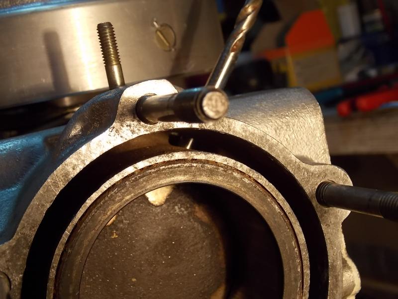Сверлим канал входа в термостат под углом примерно 30 гр. Выглядит вот так. Блок обработан под термостат по плоскости "болгаркой"