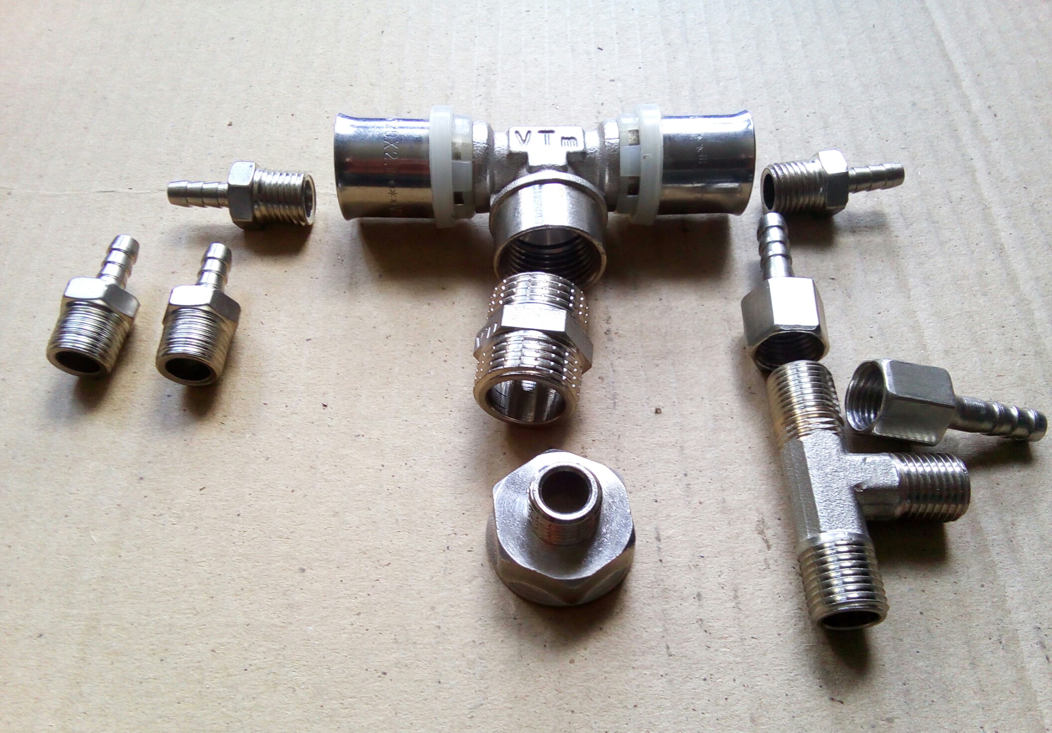 Окончательный вид со штуцерами сфоткай. У меня тоже была мысль так собрать, когда мне токарь озвучил 2 штуки за стакан, на три мотора это уже 6 тыр. Но потом нашел токаря за 1 тыс и решил не дальше не выгадывать. Эта водопроводная арматура тоже на несколько сотен потянет.